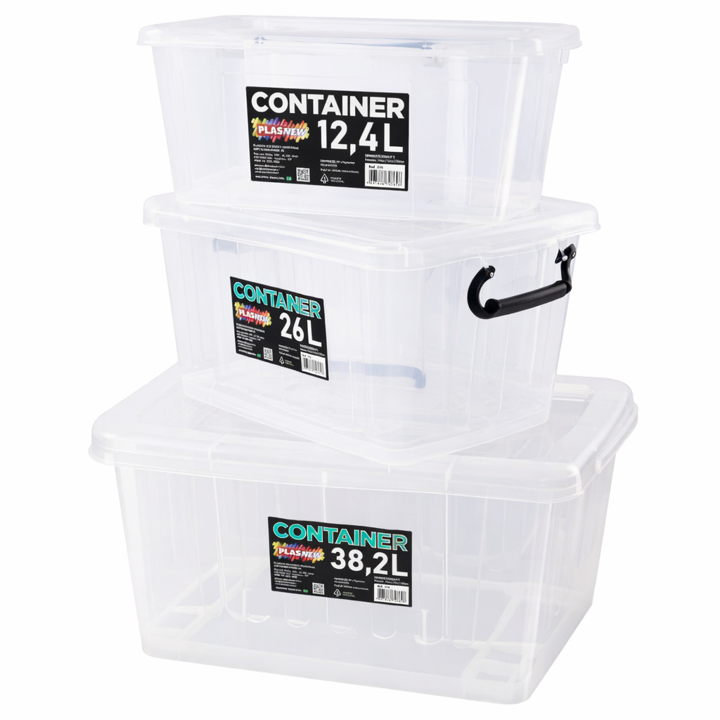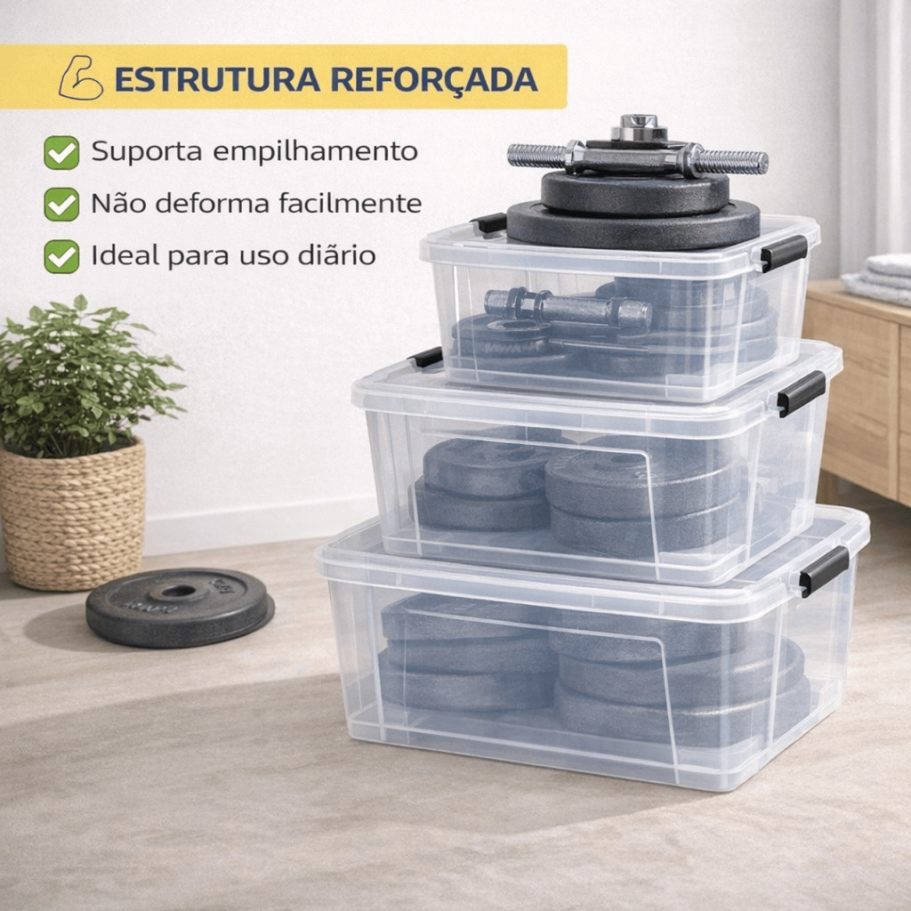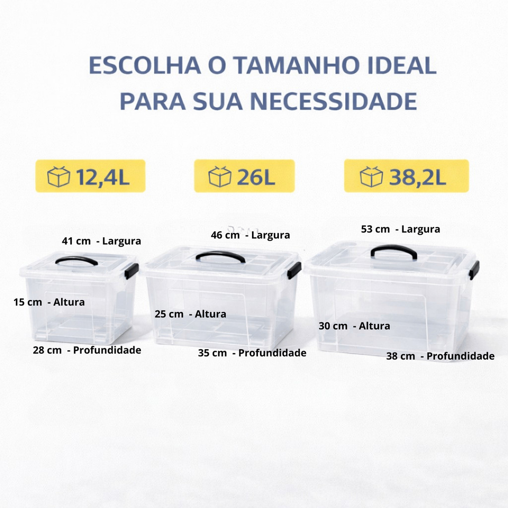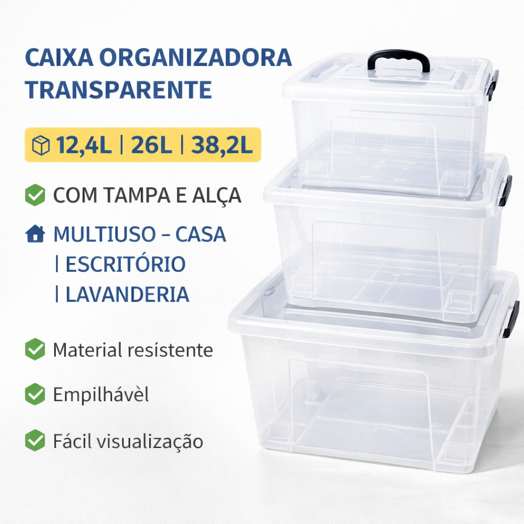 Caixa Organizadora Transparente Empilhável 12,4L 26L 38,2L Container Plástico Multiuso com Tampa