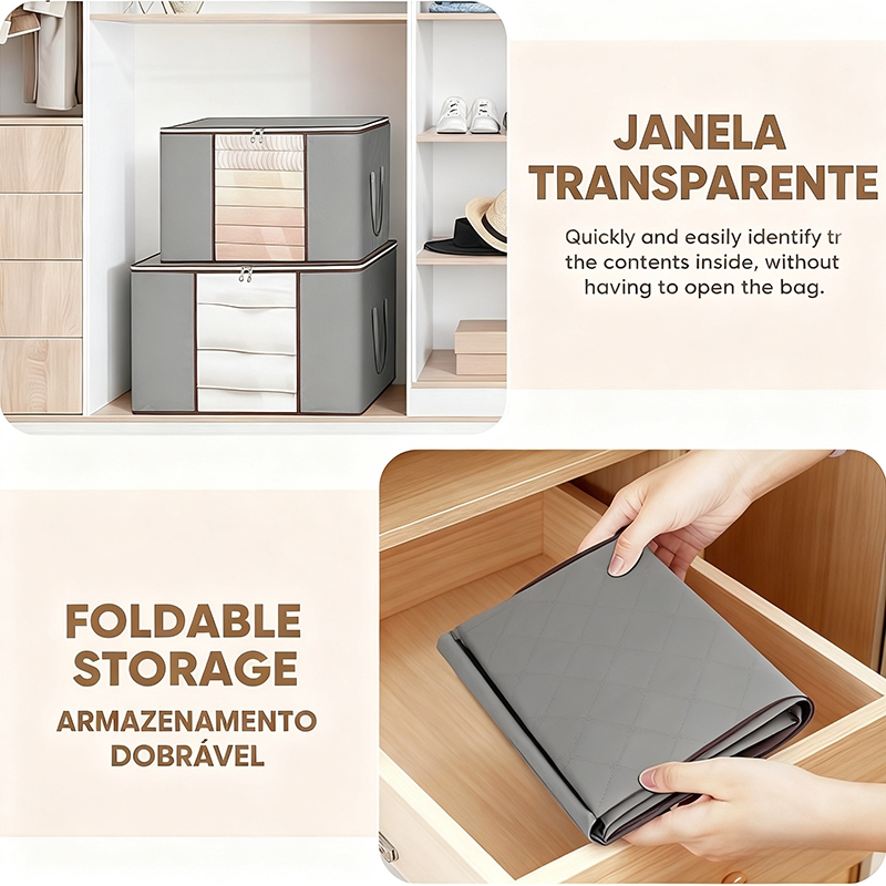 Caixa Organizadora de Guarda-RoupaGrande, com Tampa, Dobrável e Portátil,Anti-Poeira, Anti-Umidade e Anti-Tracas