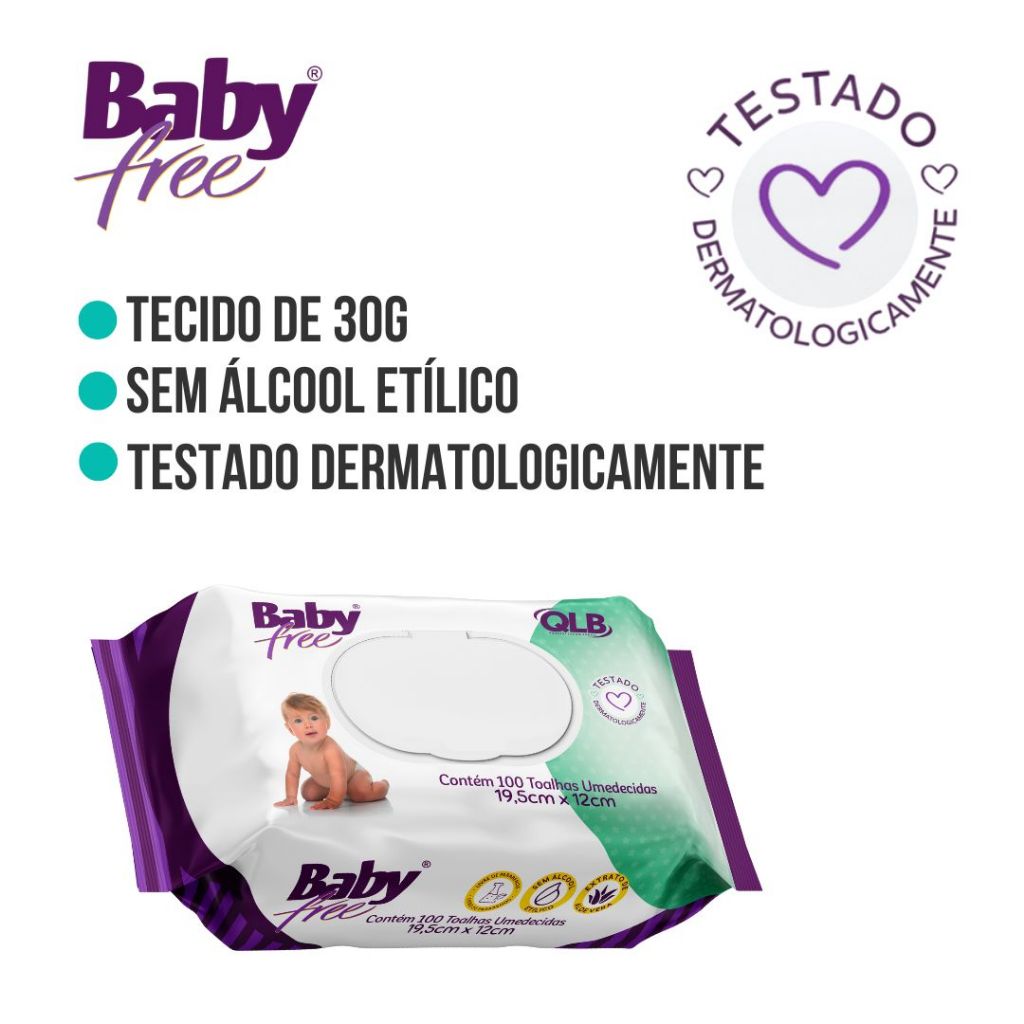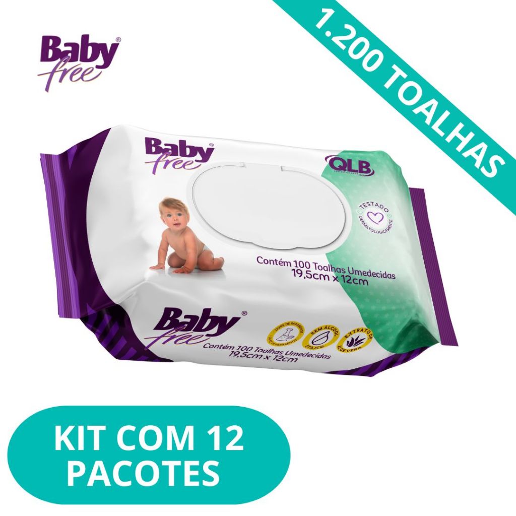 Caixa com 12 Lenços/Toalhas Umedecidas Baby Free c/ 100 Unidades Cada – Tampa FlipTop