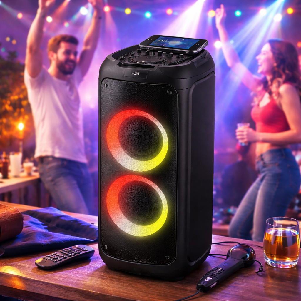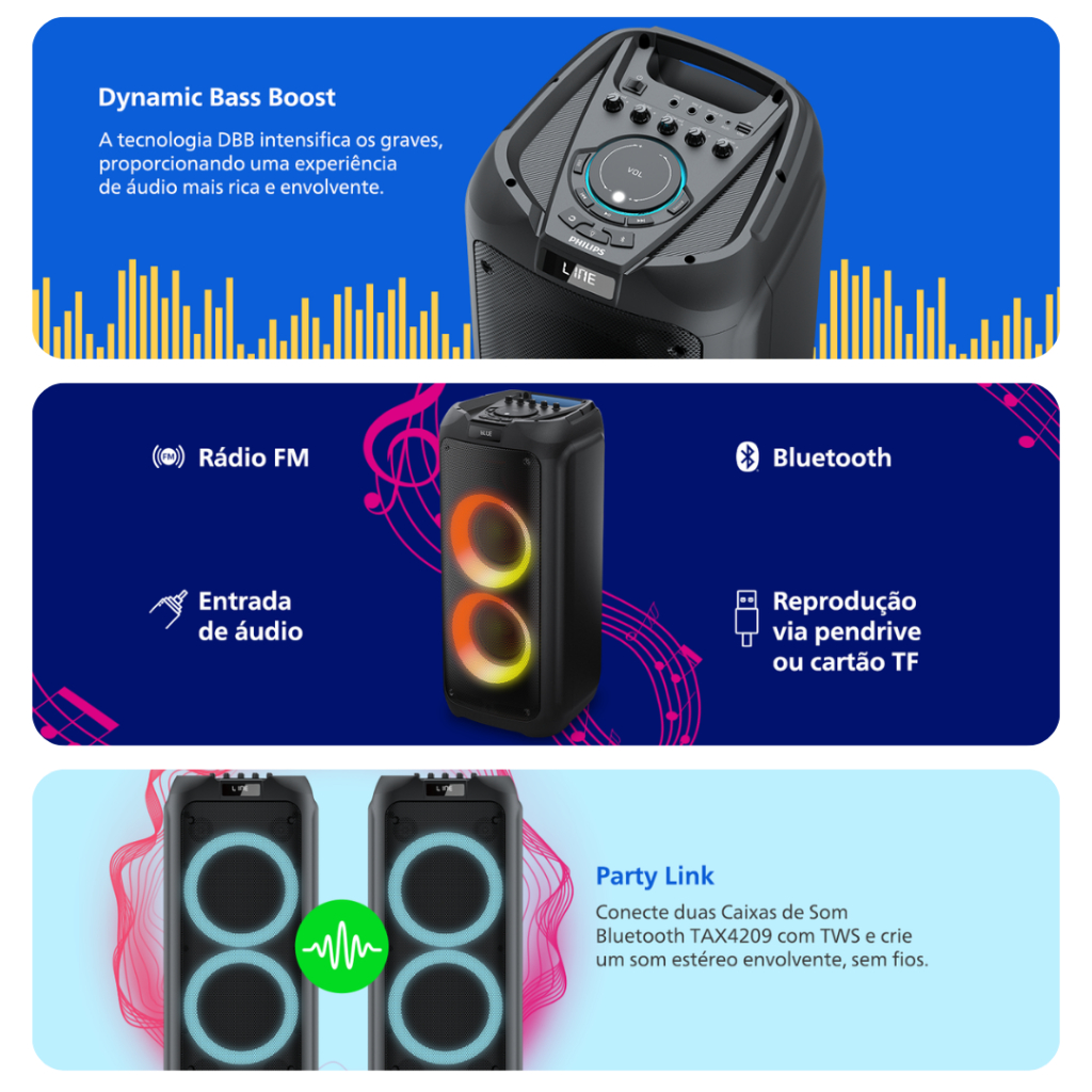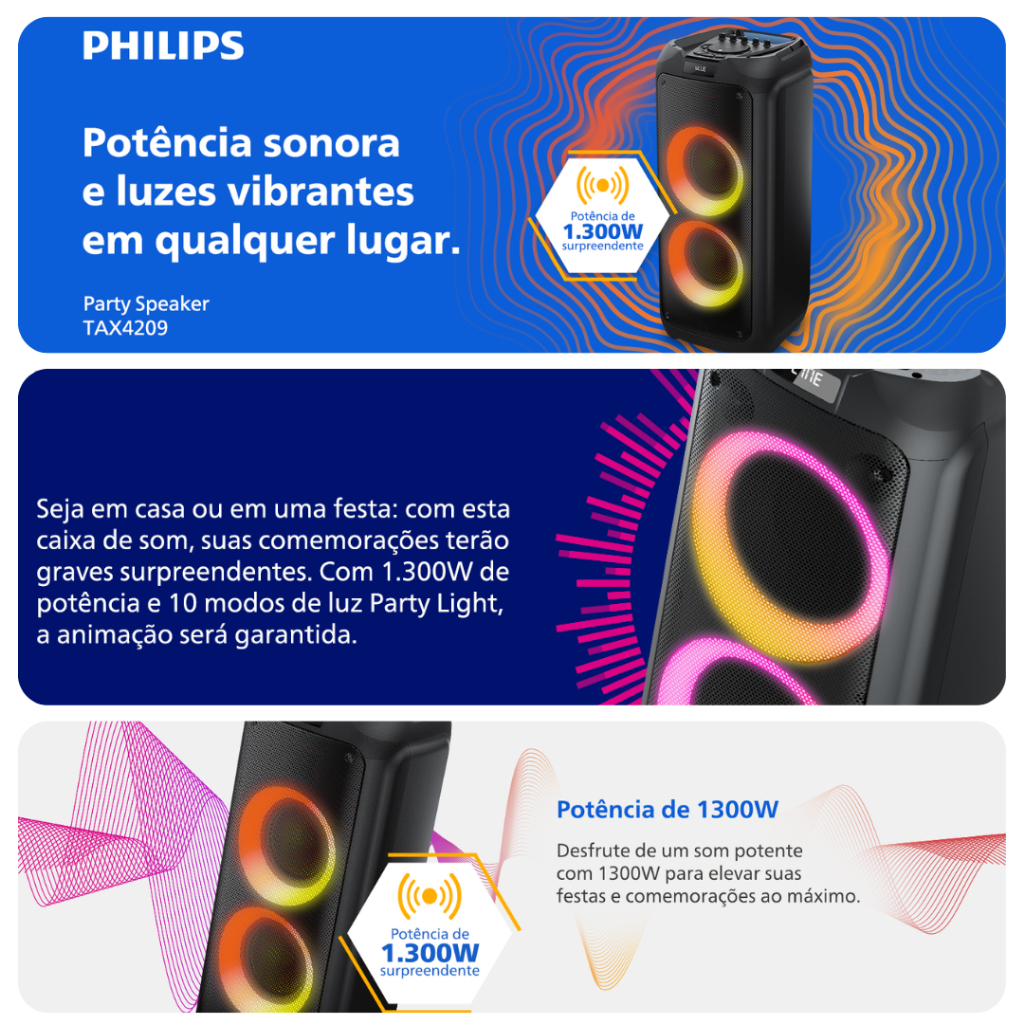 Caixa de Som Bluetooth Karaokê Philips 1300W Party Speaker LED USB AUX Bivolt Função TWS Cartão SD