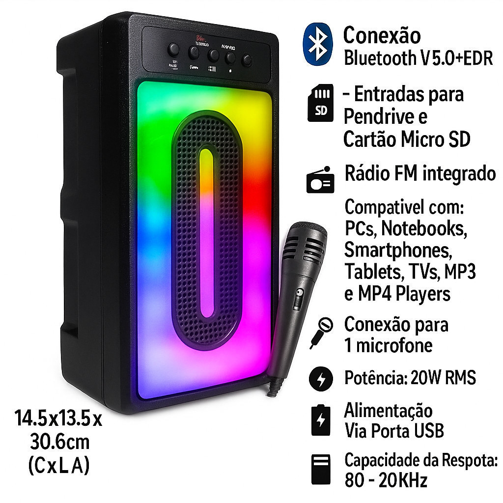 Caixa de Som Bluetooth Led RGB TWS USB P2 Rádio FM Entrada P10 Com Mic Karaokê Suporte Para Celular