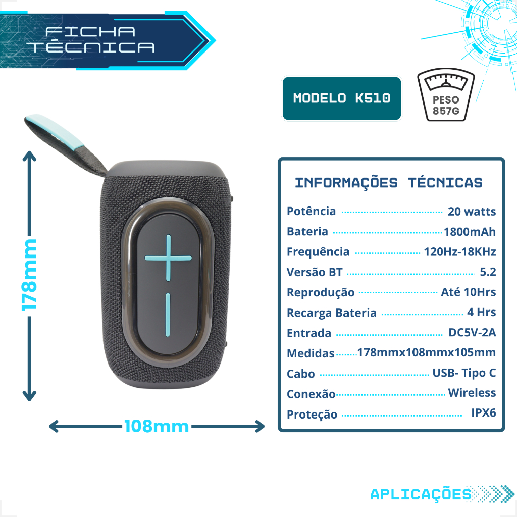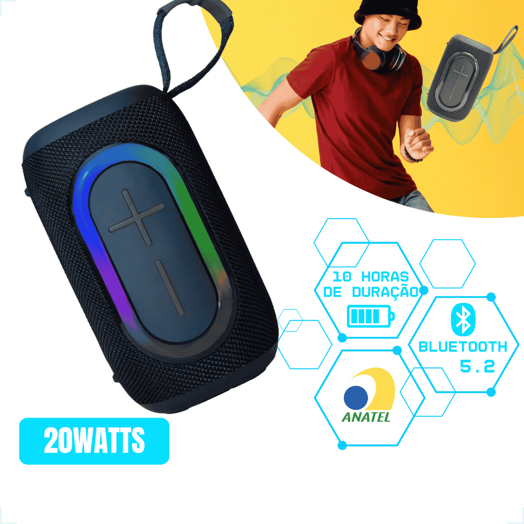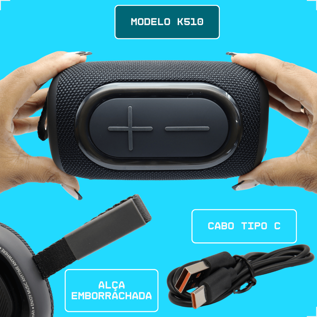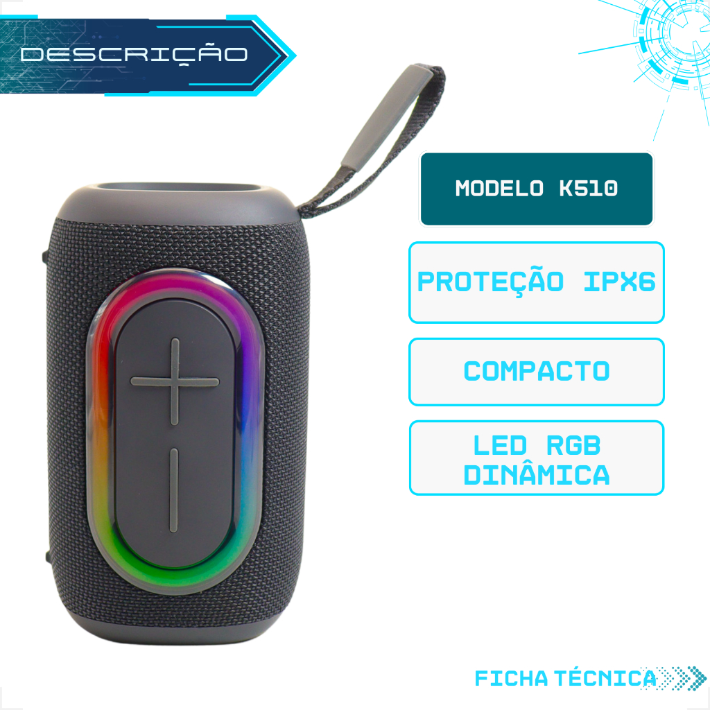 Caixa de Som Bluetooth Portátil Pequena 20W RGB K510 ANATEL IPX6 Alto Falante Subwoofer FM KIMASTER