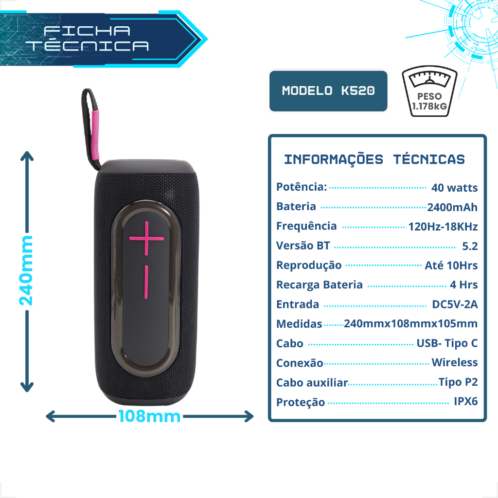 Caixa de Som Bluetooth Portátil Potente KIMASTER 40W 20W K520 K510 ANATEL IPX6 Rádio FM SD IPX6