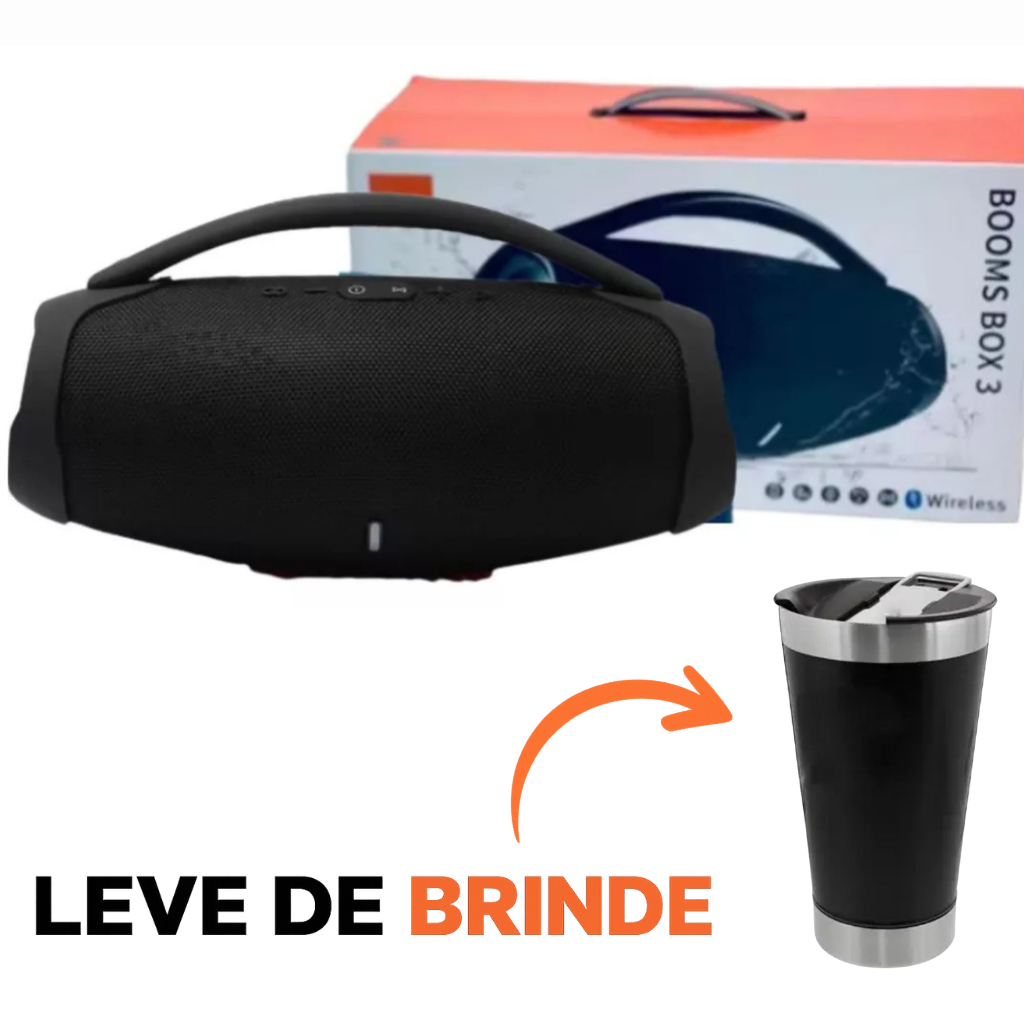 Caixa de Som Booms Box 3 Bluetooth Potente + Brinde Copo Térmico Preto