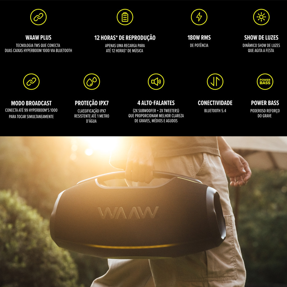 Caixa de Som Portátil 180W RMS com Bluetooth Hyperboom 1000 Até 12 Horas IPX7 Luz Led Waaw