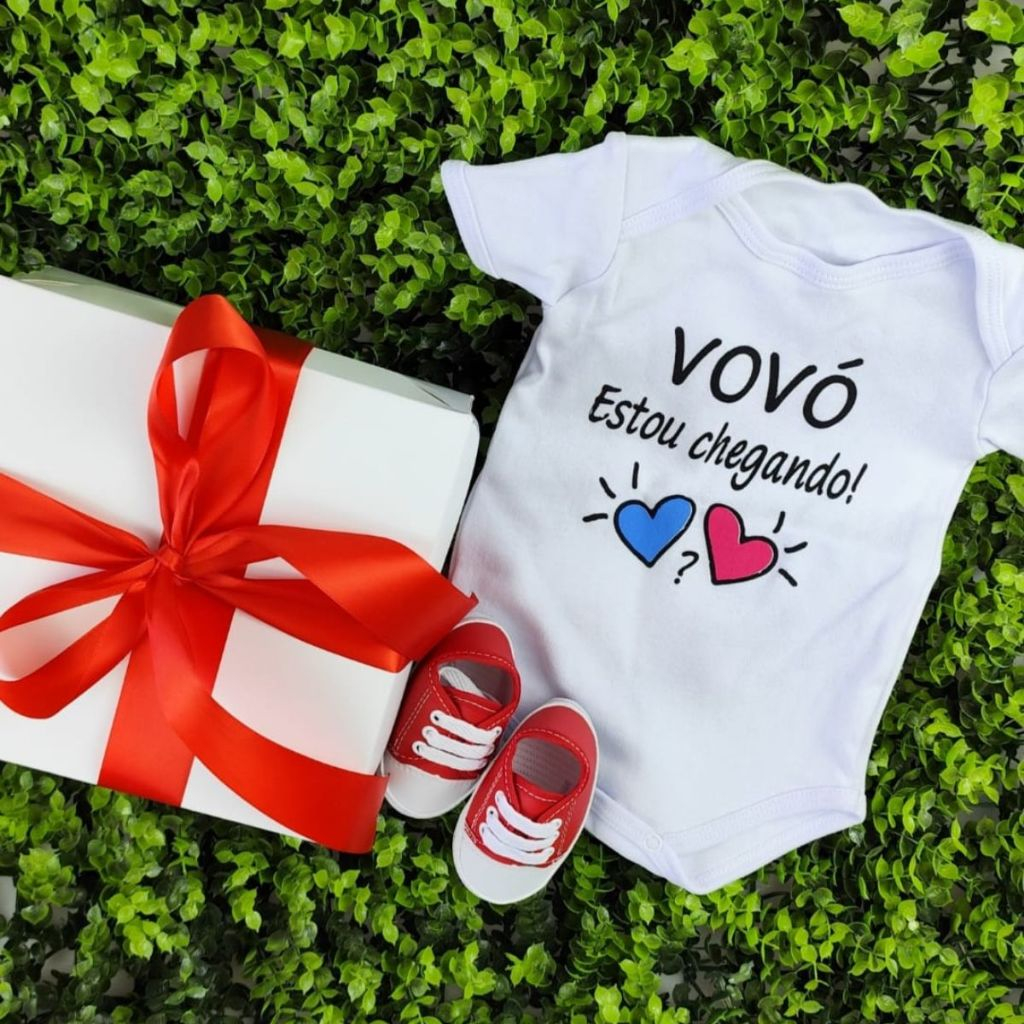 Caixinha Revelação de Gravidez Surpresa com Body Manga Curta e Sapatinho Anúncio Grávida