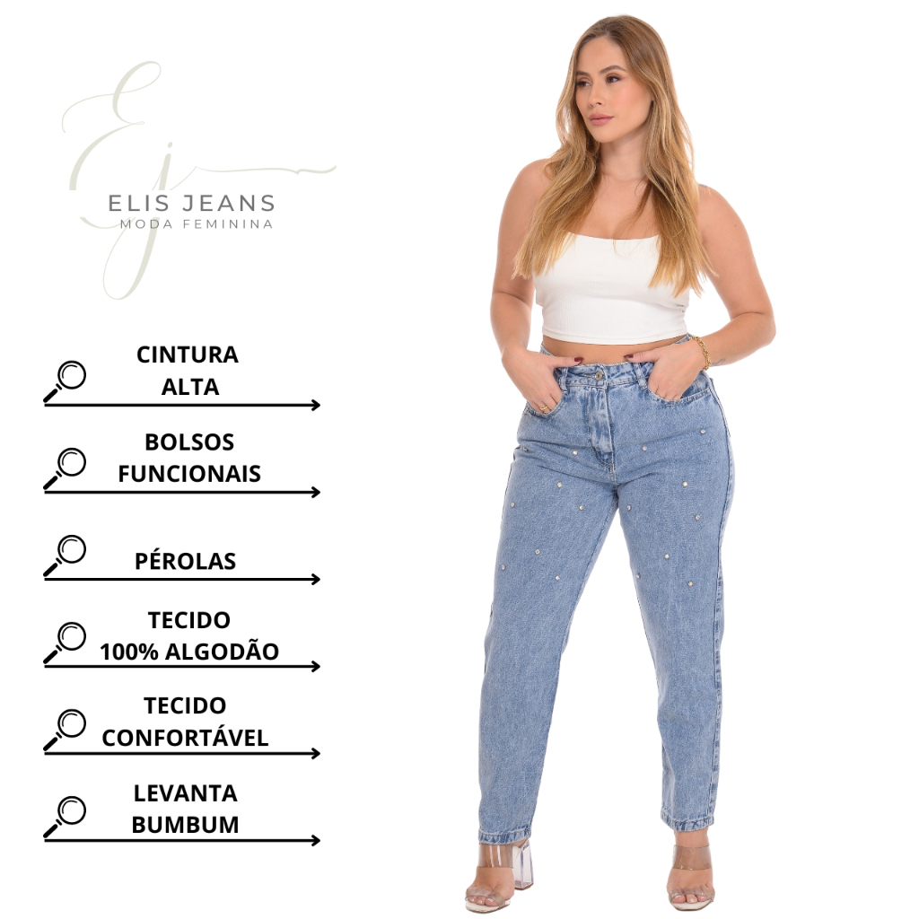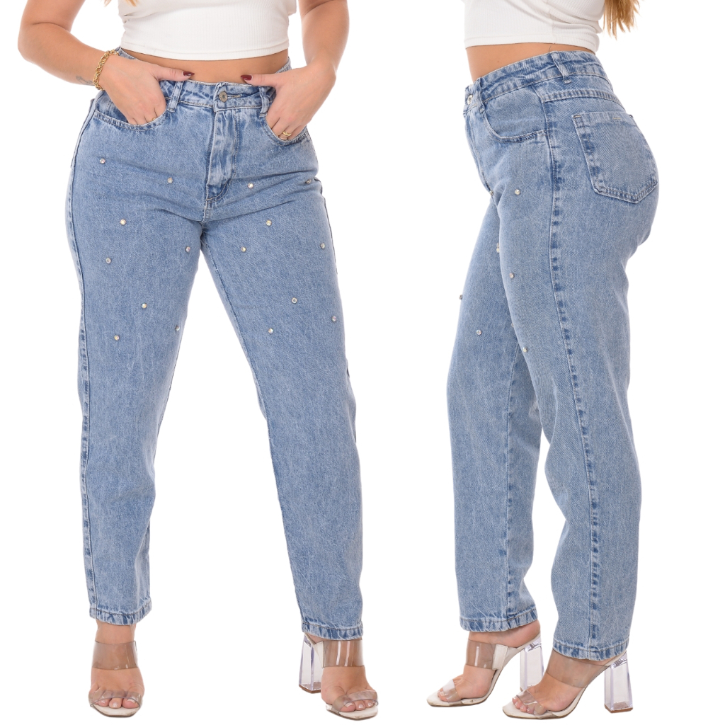 Calça Mom Jeans Feminina Cintura Alta Com Pérola