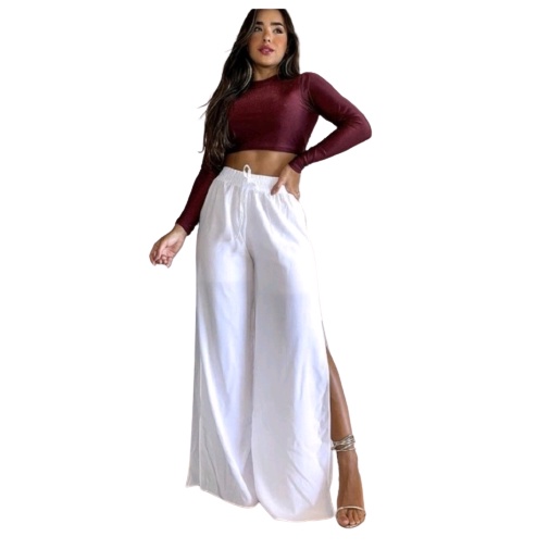 Calça Pantalona Feminina Fendas Laterais Cintura Cordão Forrado Tendências Moda