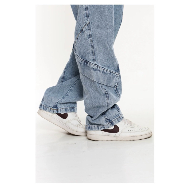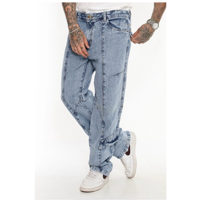 Calça Reta com Recorte e Pala Azul Casual Moderna
