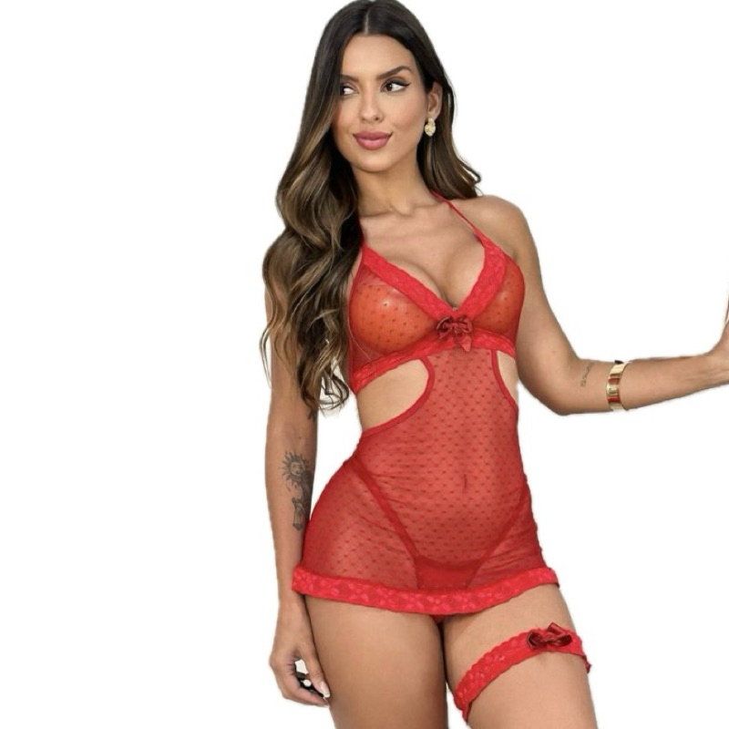 Camisola Cintia Sensual Tule Poa com Calcinha Perneira