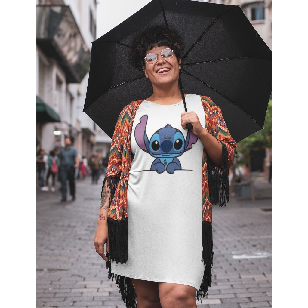 Camisola De Manga Curta Dress Branca Estampa Stitch