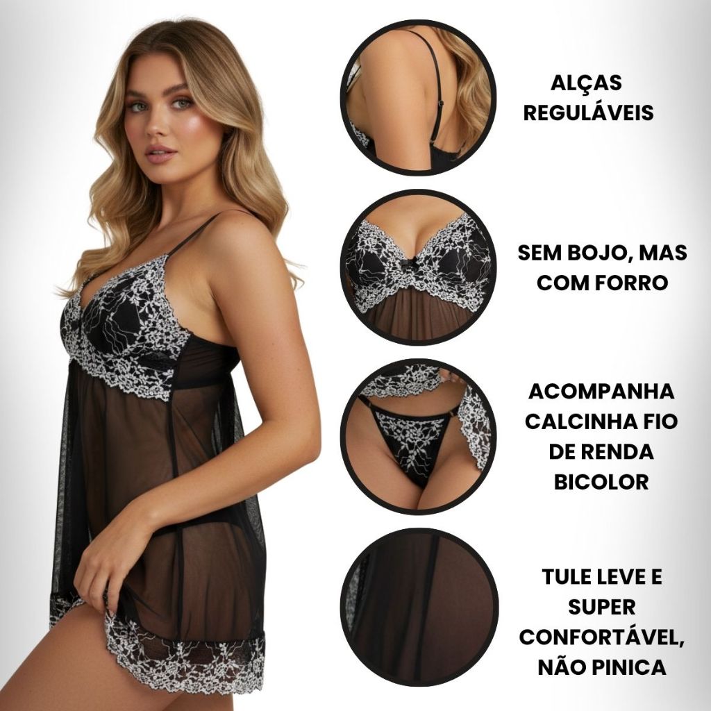 Camisola Linda Tule Transparente Espera Marido Com Calcinha Sensual Alcinha Fio Linda Renda Sem Bojo