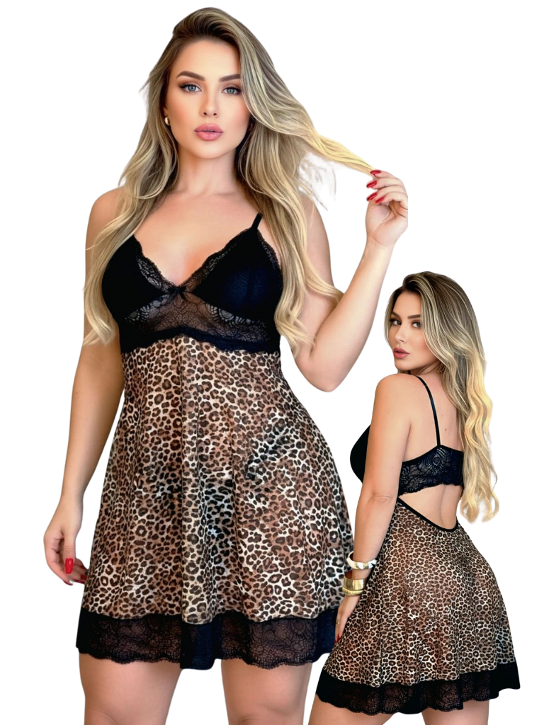 Camisola Sexy Oncinha com calcinha sem bojo regulagem nas alças roupa de dormir pijama feminino