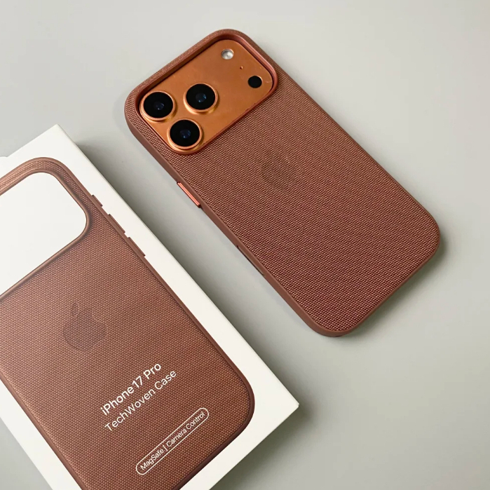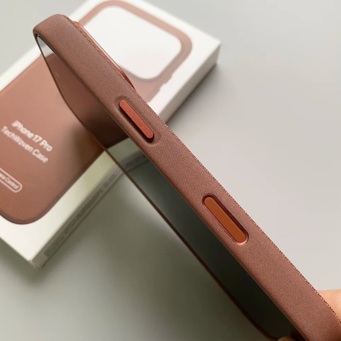 Capa protetora TechWoven MagSafe para iPhone 17 Pro Max, com botões de controle e design trançado magnético.