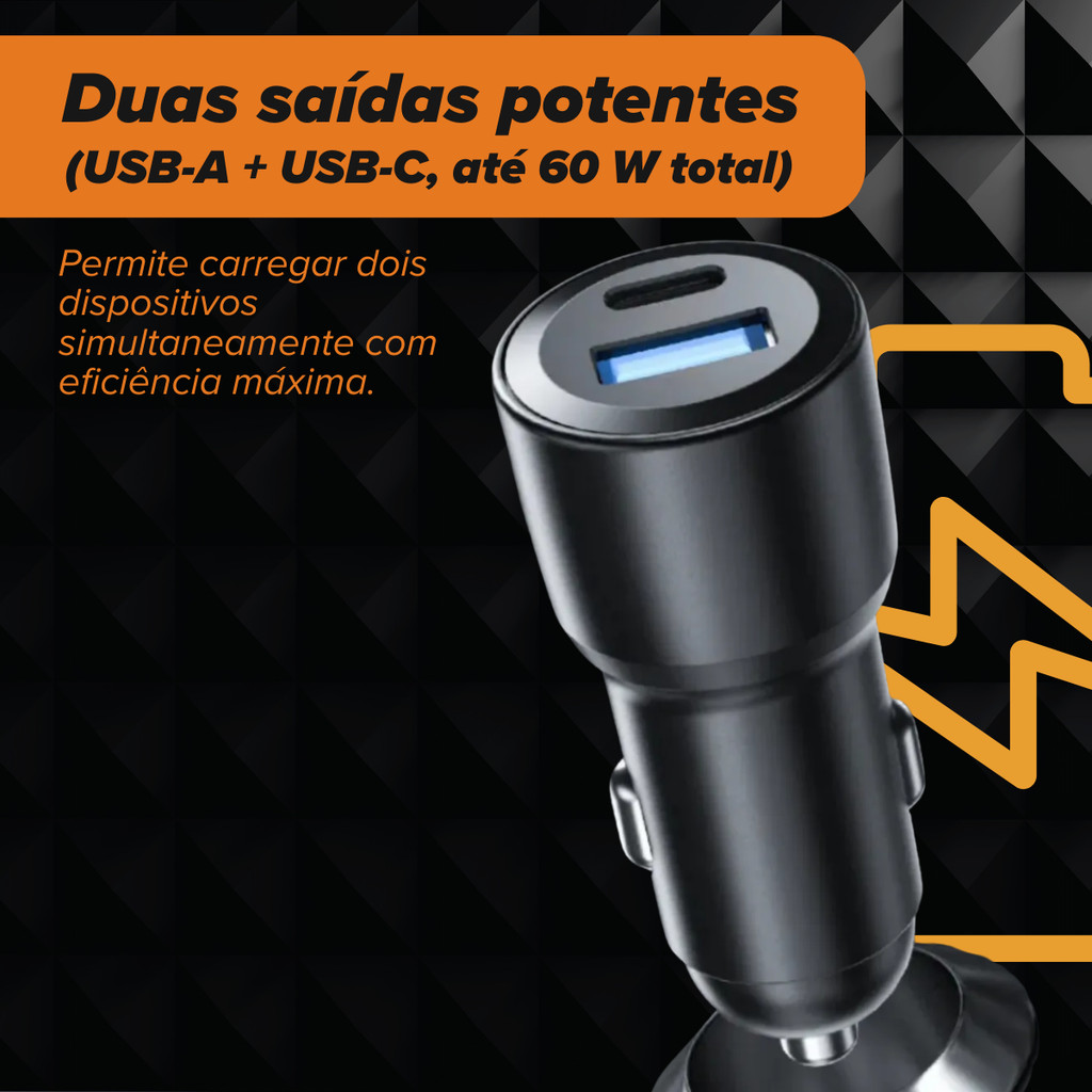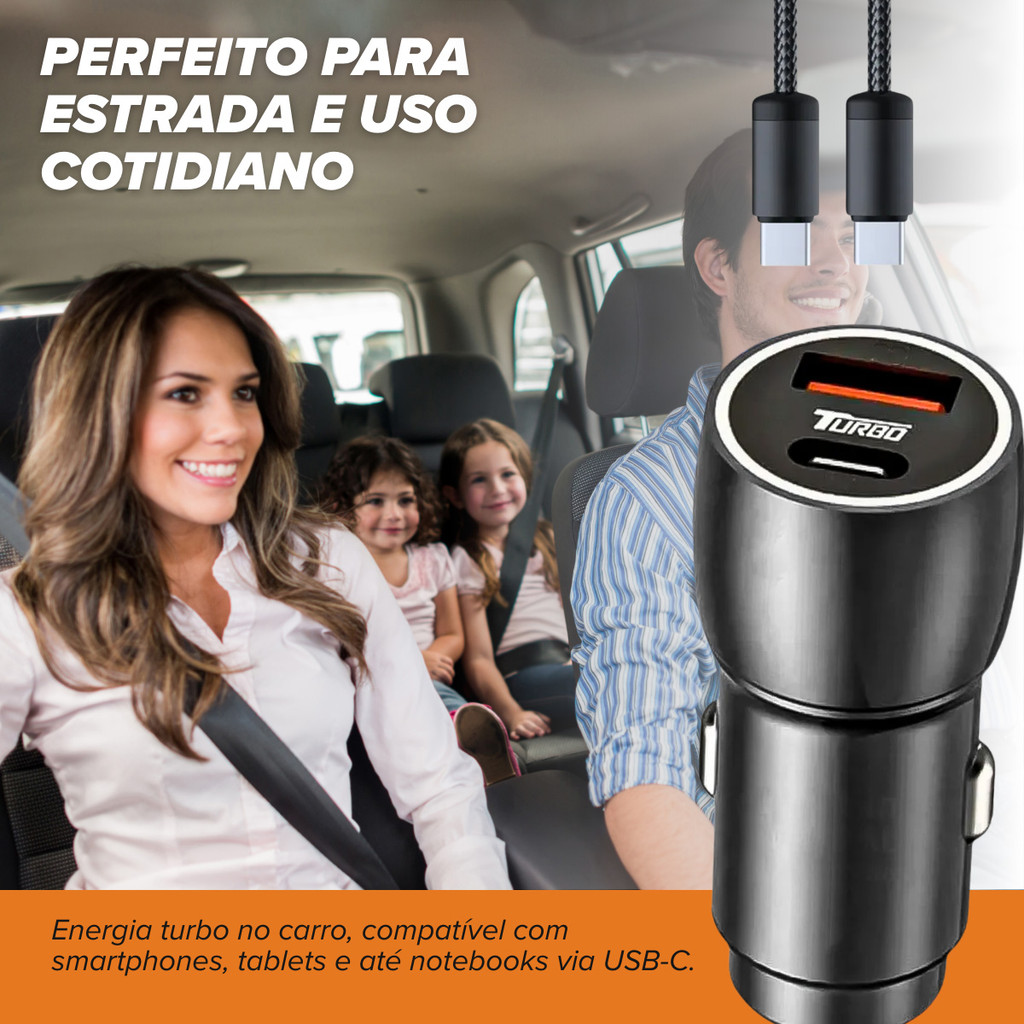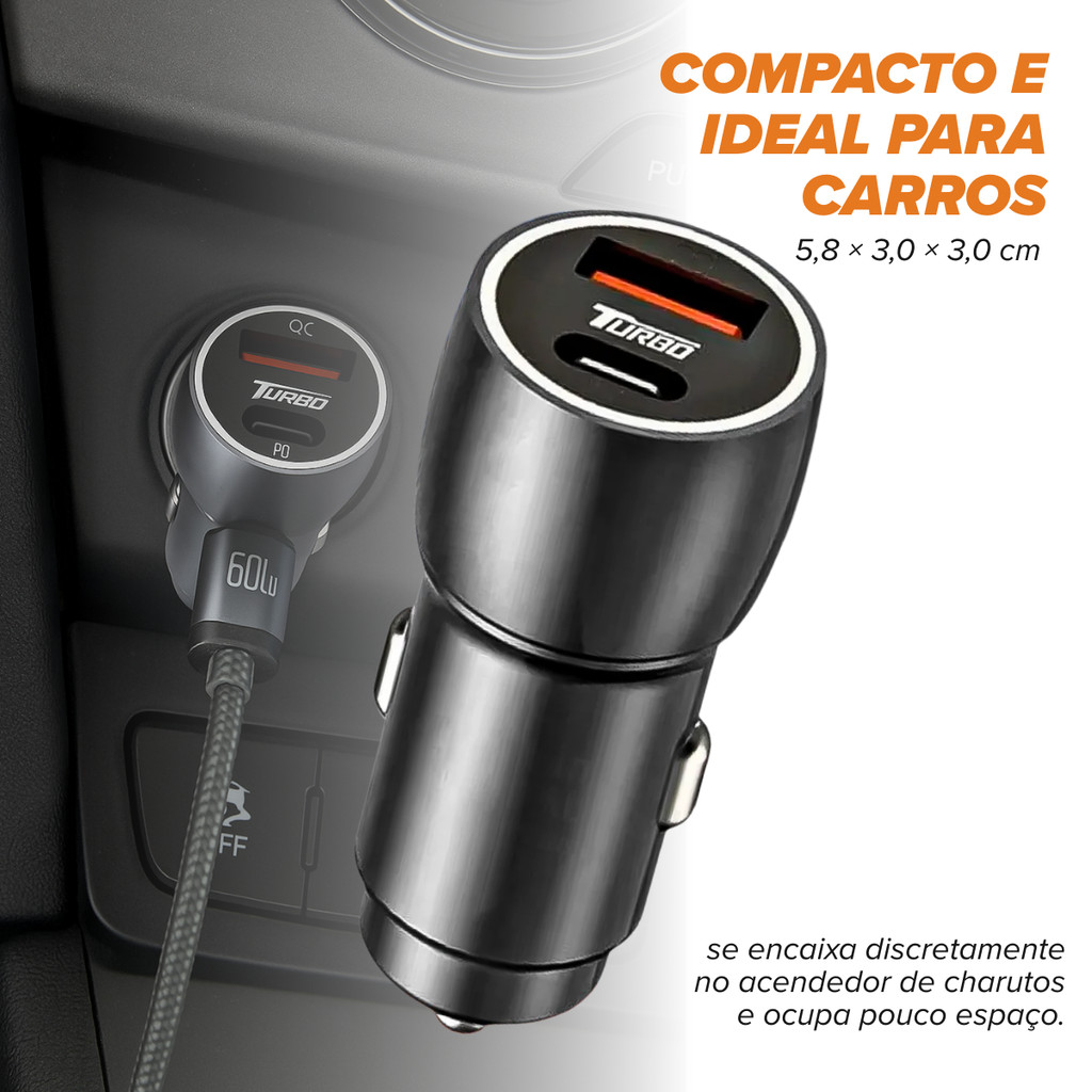 Carregador Veicular Turbo 60W Kit Com Cabo 2 Saídas USB + Tipo C (USB-C) Super Rápido