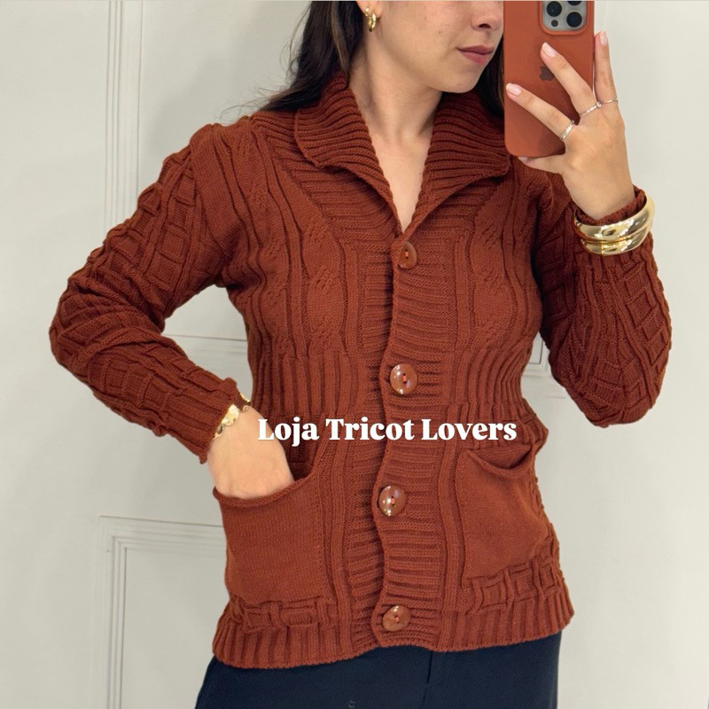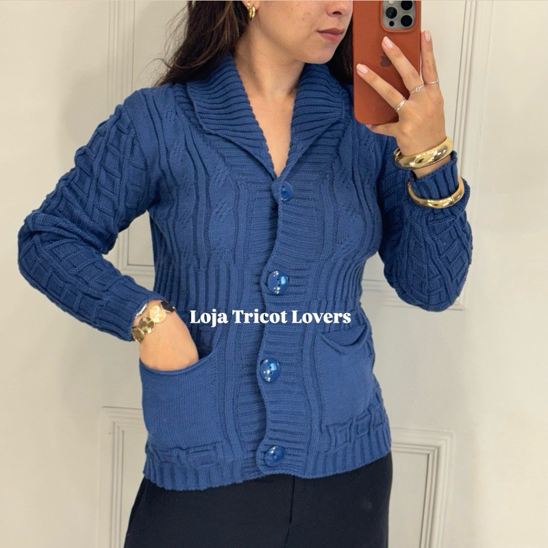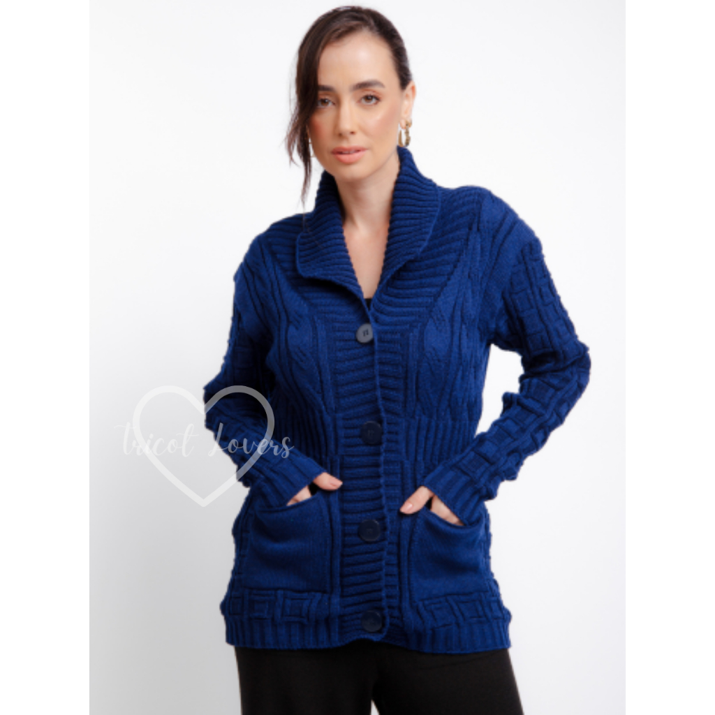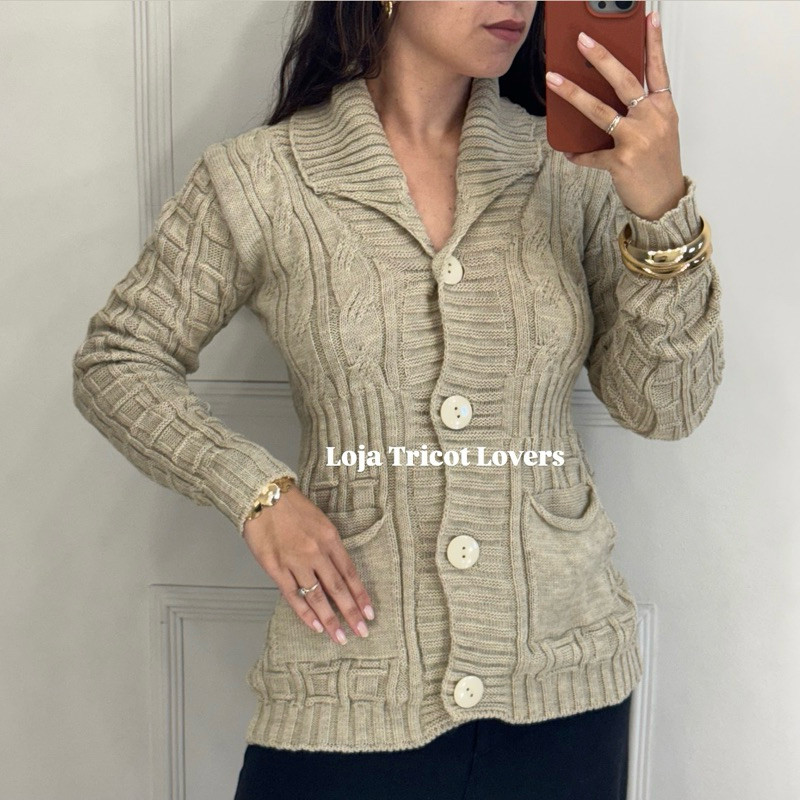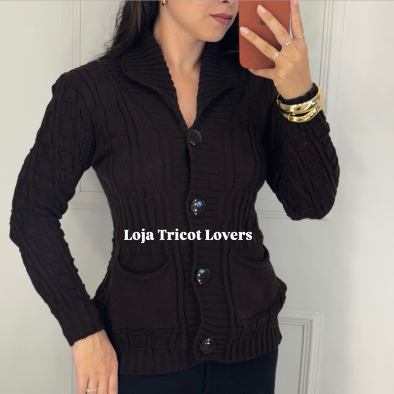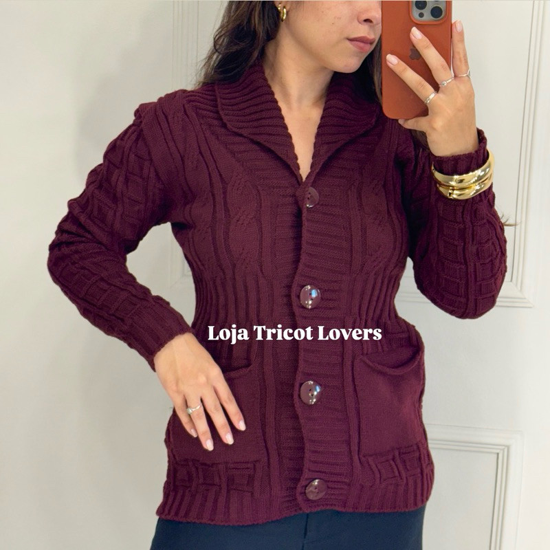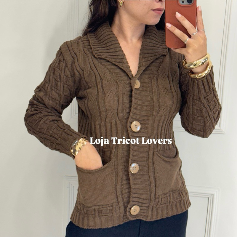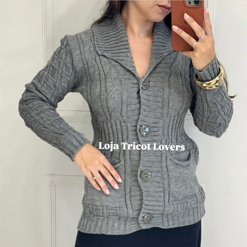 Casaco Feminino Tricô Com Botões e Bolsos Inverno Modelagem Ampla