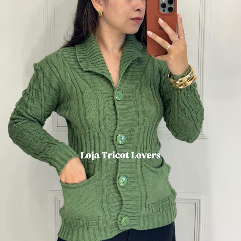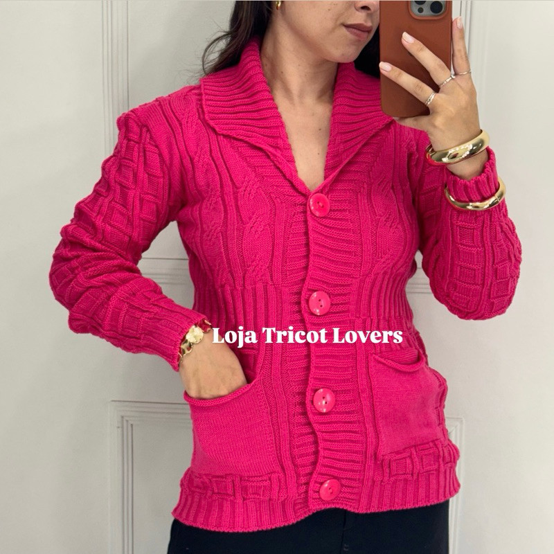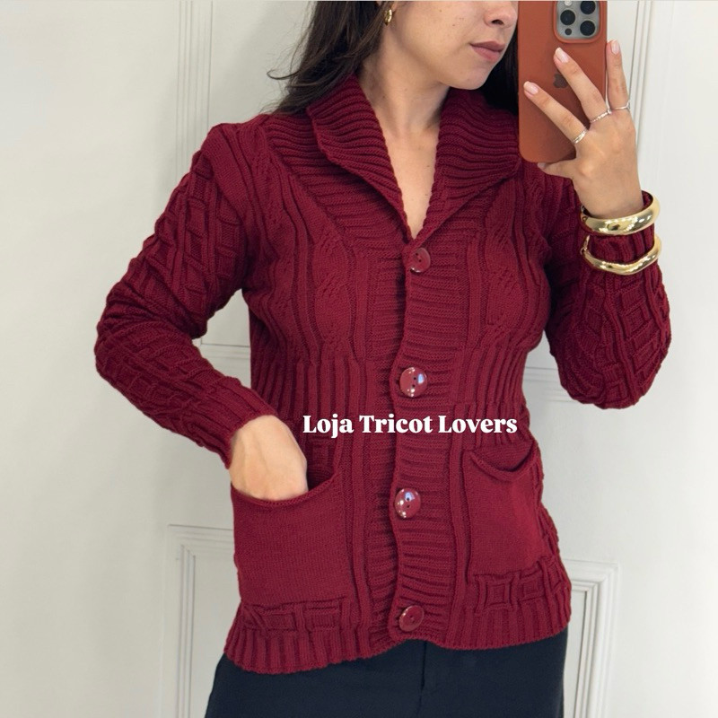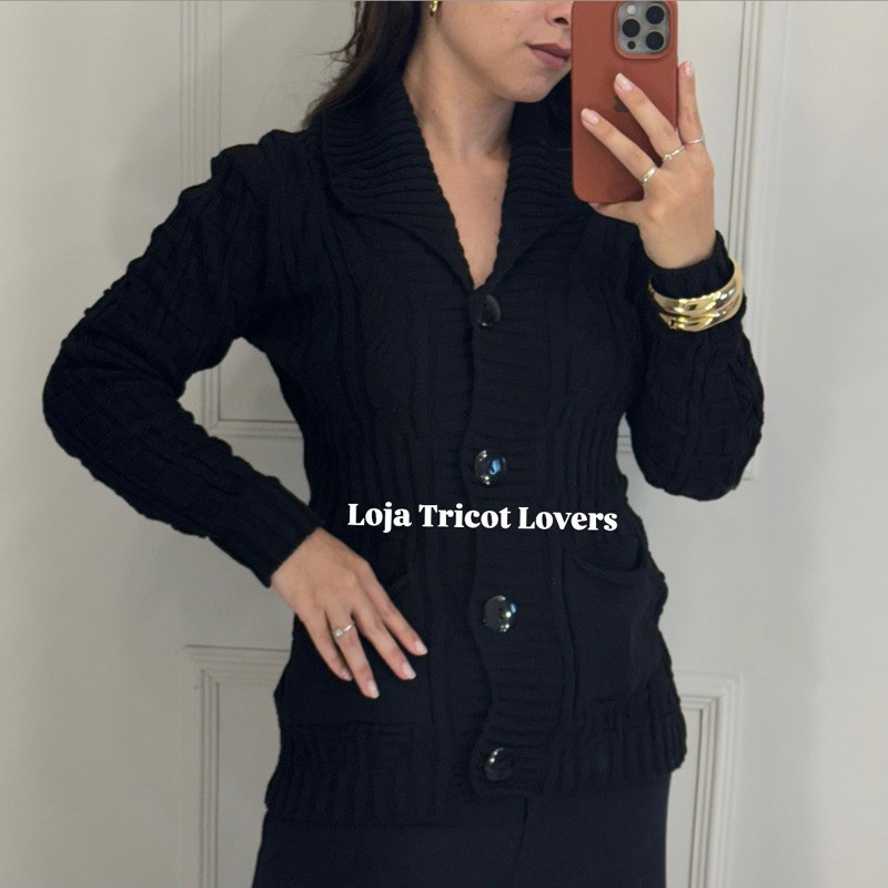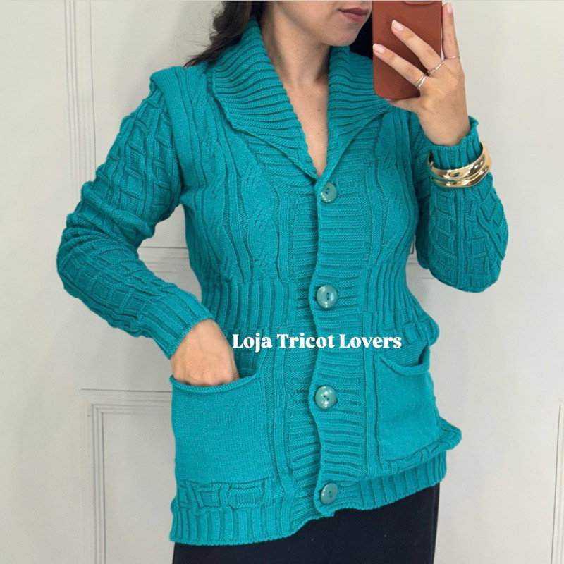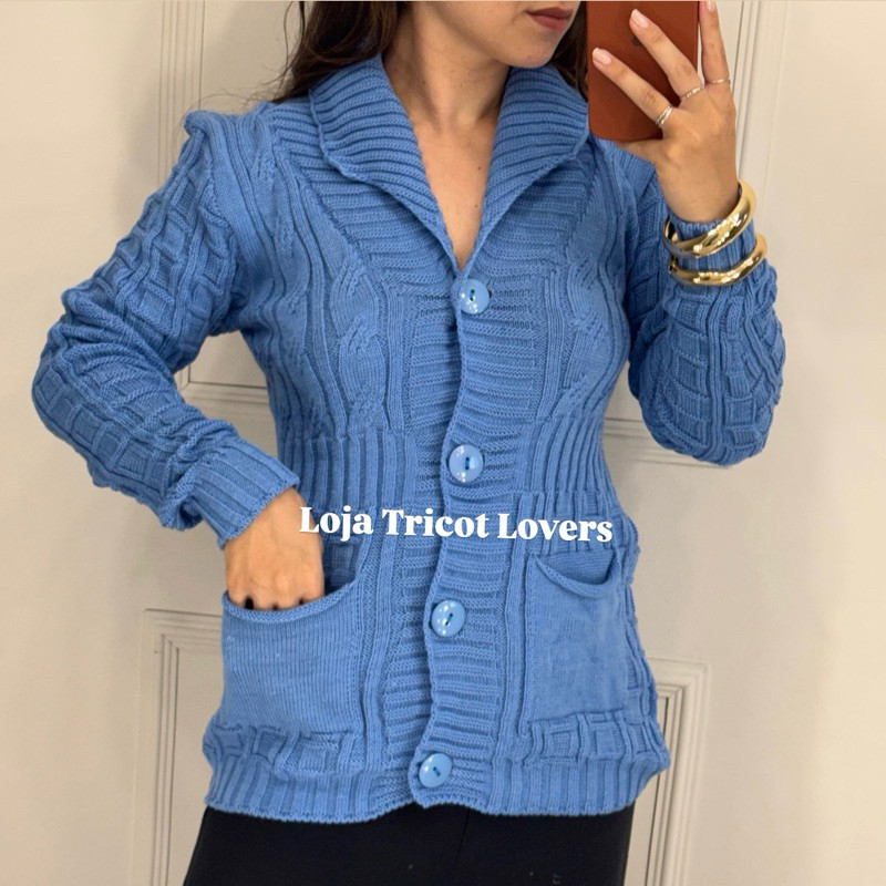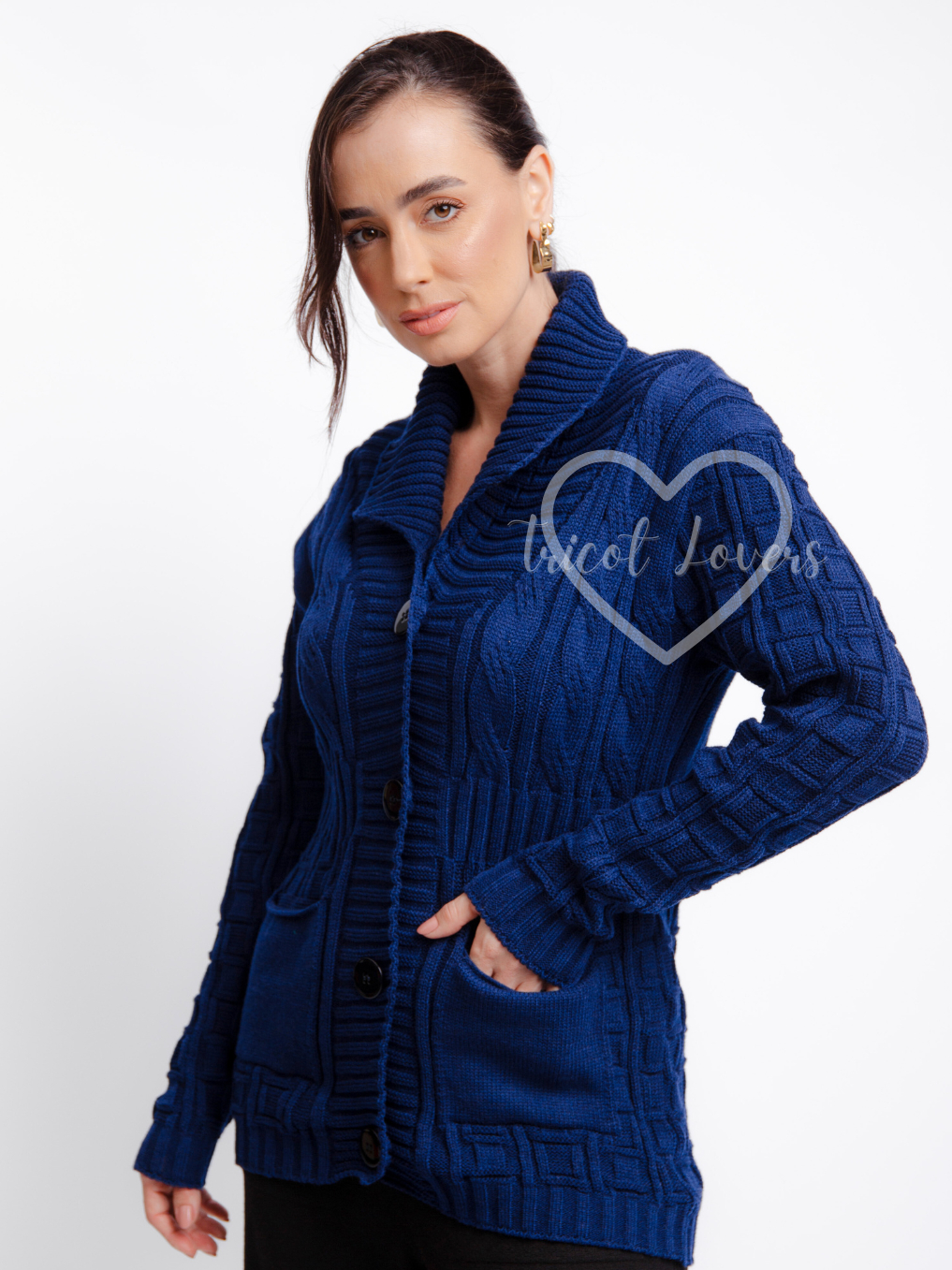 Casaco Feminino Tricô Com Botões e Bolsos Inverno Modelagem Ampla