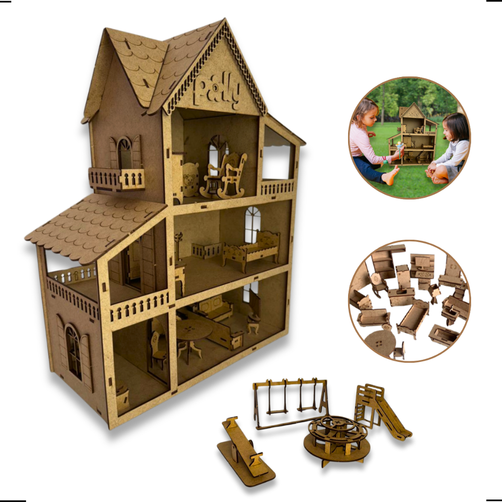 Casinha de Boneca Infantil com Moveis acompanha Parquinhos em Mdf Pintada
