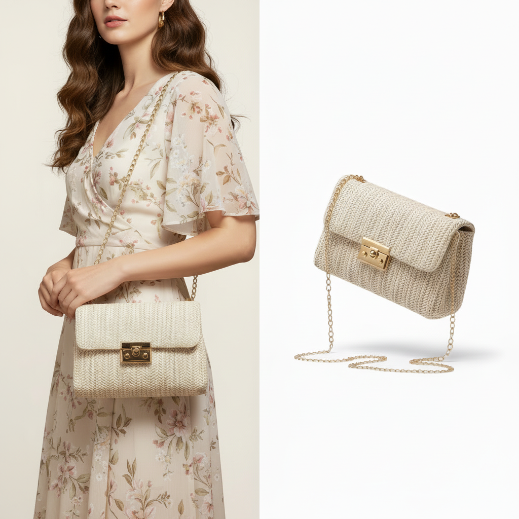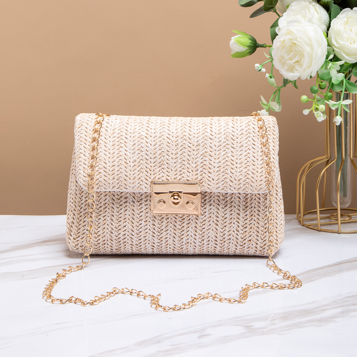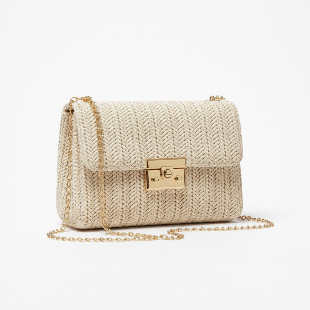 Bolsa Tote De Praia Feminina De Palha Tecida Crossbody Com Fecho De Corrente De Ombro Quadrada Minimalista ​