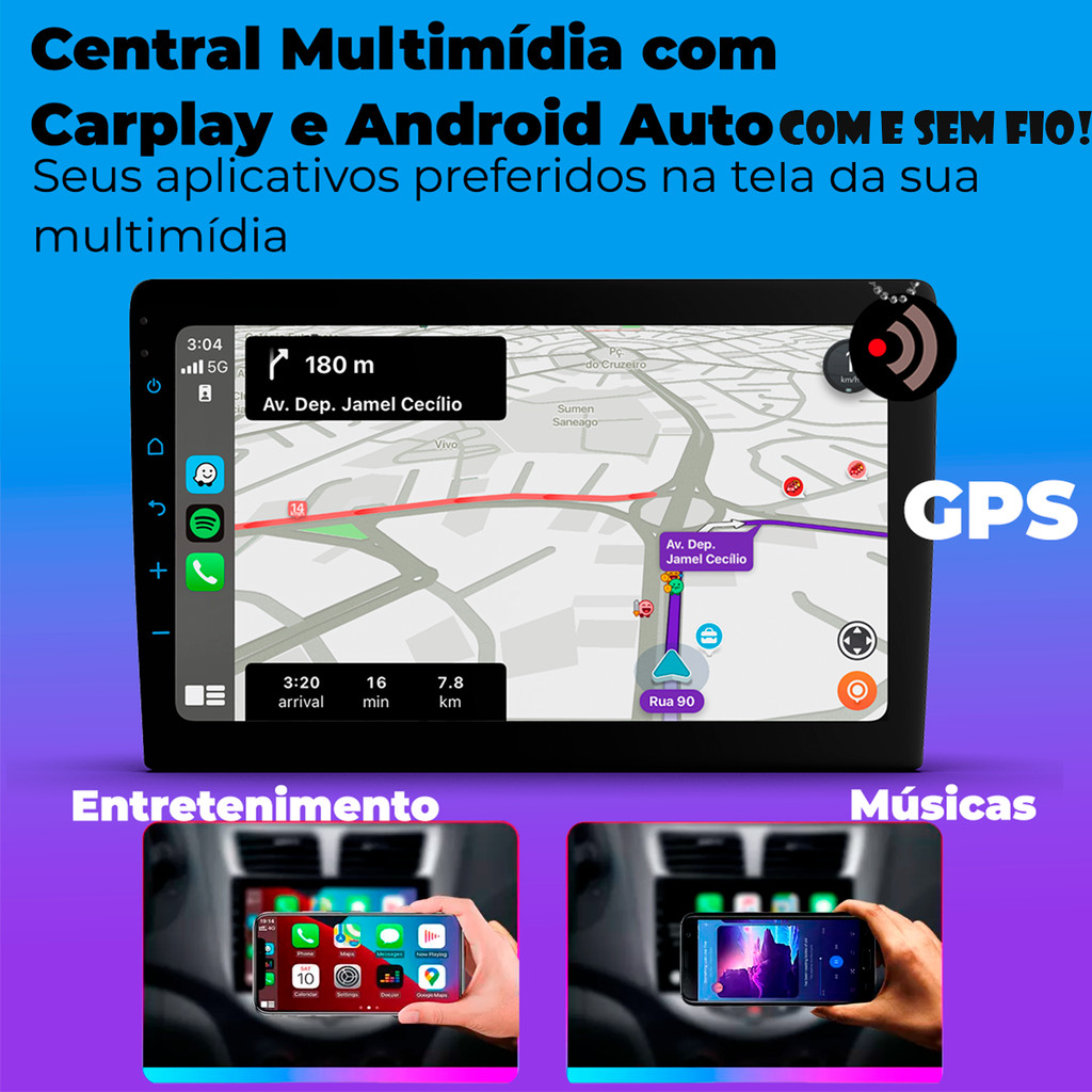 Central Multimídia Automotiva MP5 9 Polegadas Slim Full Touch CarPlay e Android Auto Com e Sem Fio