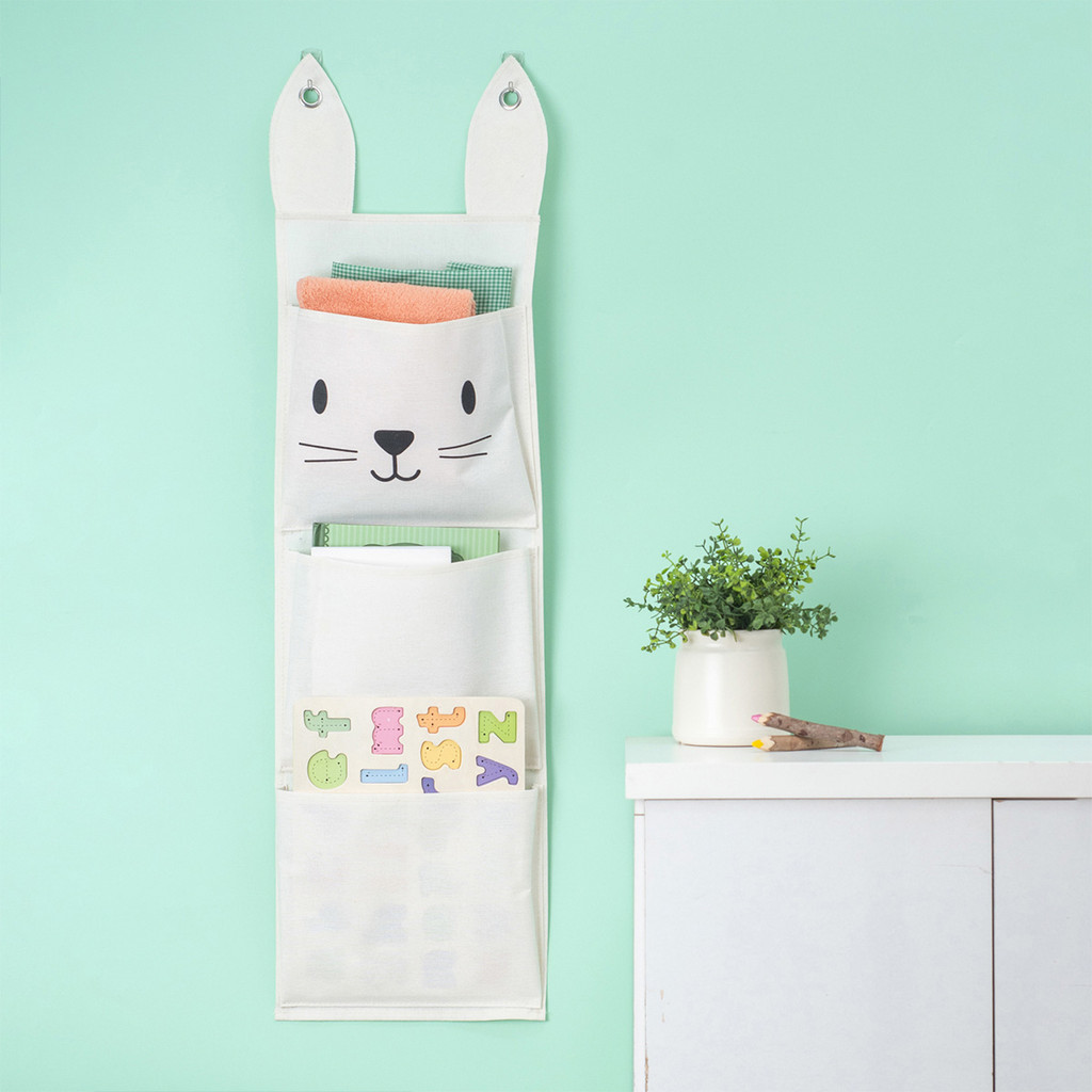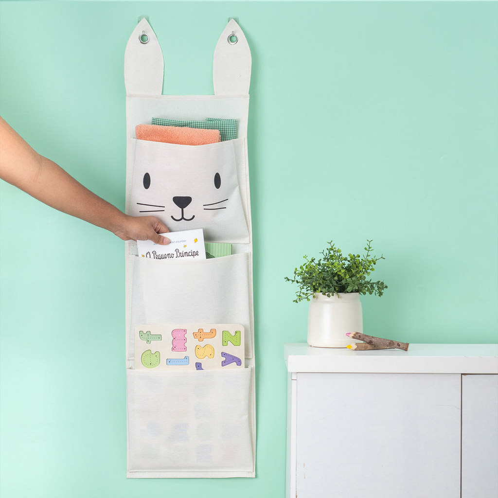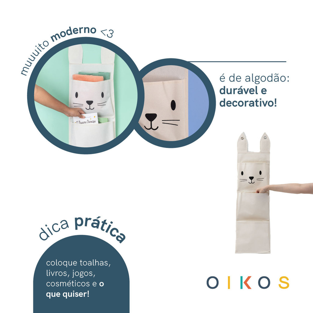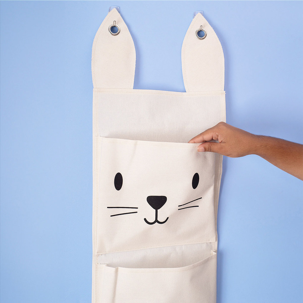 Cesto infantil de parede com 3 bolsos de algodão coelho - Oikos