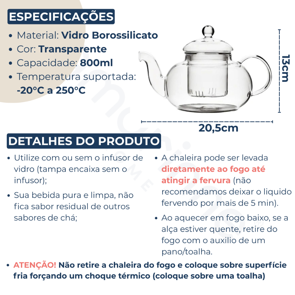 Chaleira Bule De Vidro Com Infusor Chá Direto Ao Fogo Resistente Ao Calor 800ml