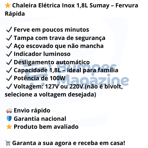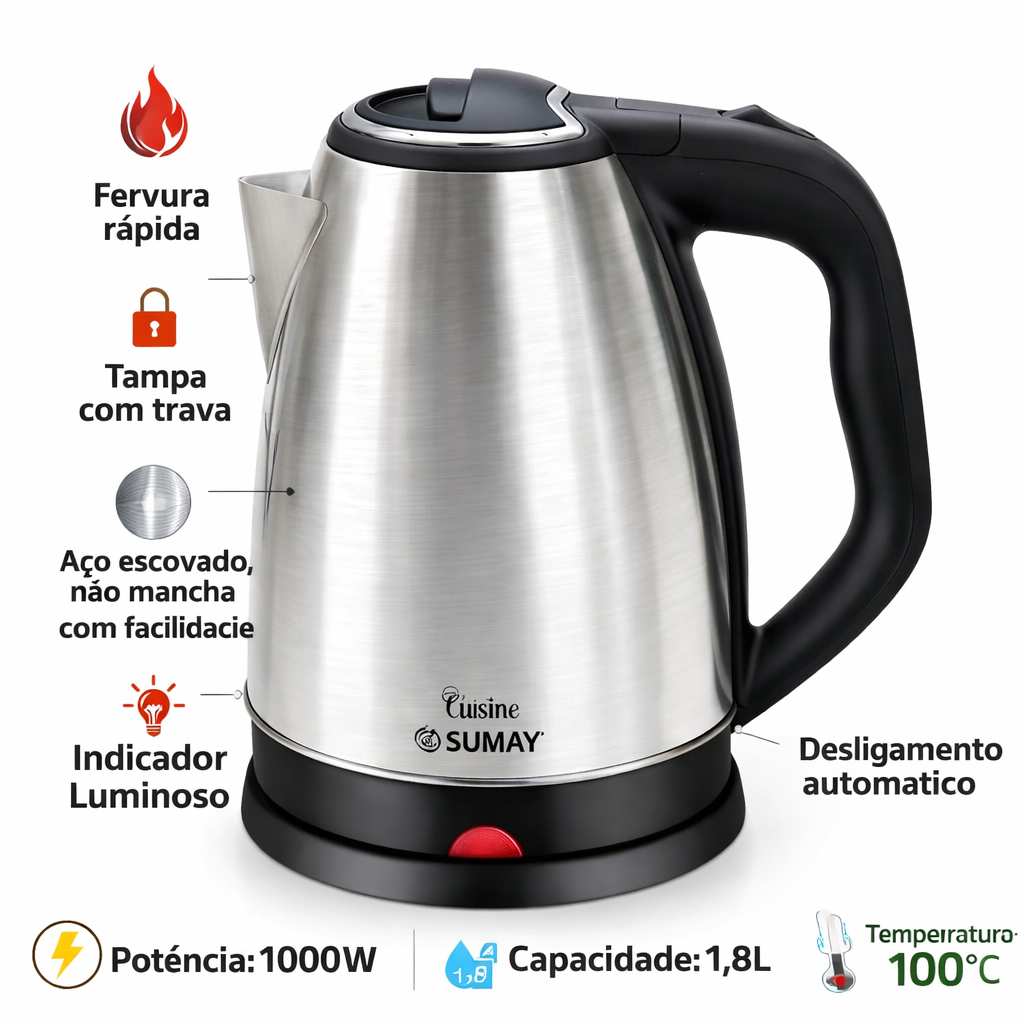 Chaleira Elétrica Inox 1,8L Desligamento Automático 100W Sumay