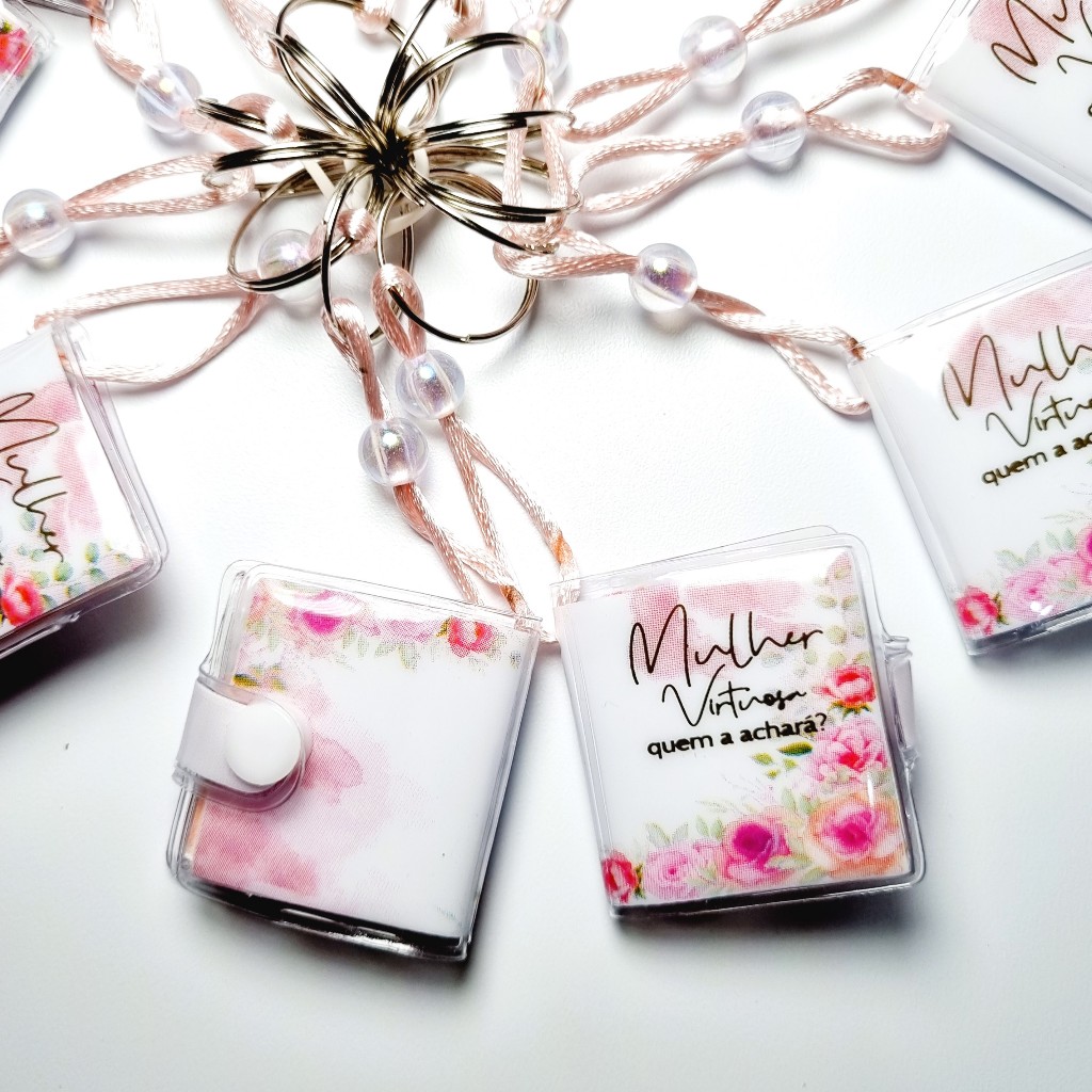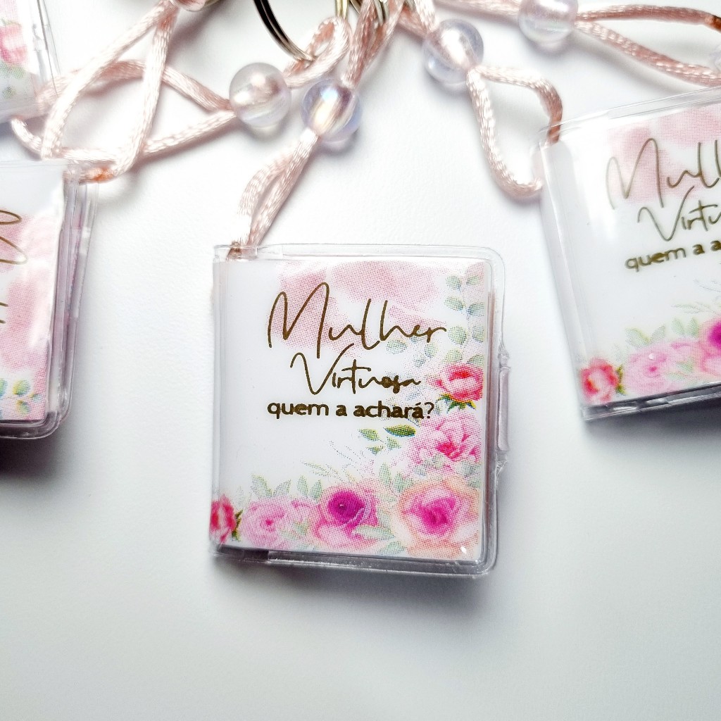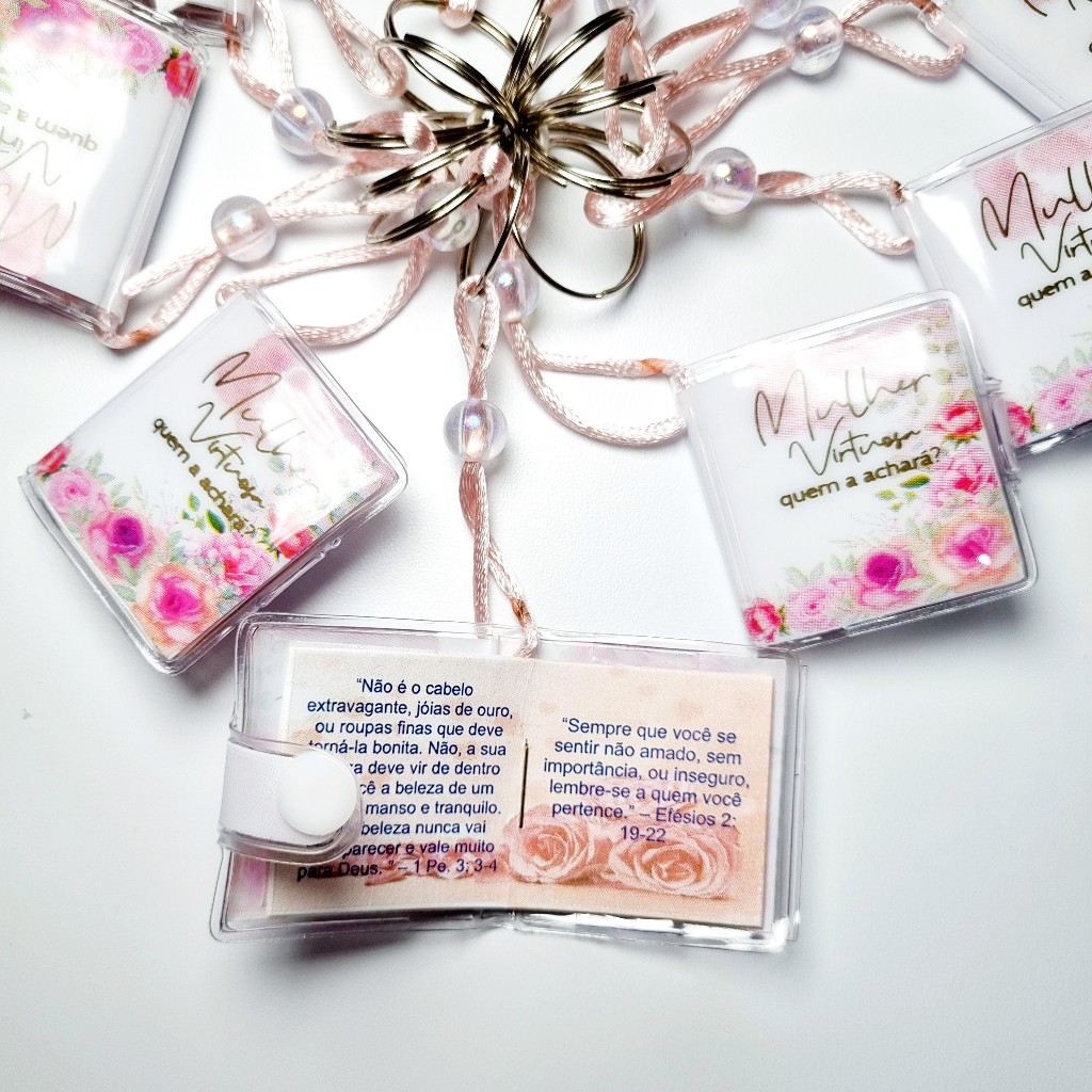 Chaveiro Bíblia Mulher Virtuosa Flores Rosas com Pérola. Kit 12 Pçs. (b06)