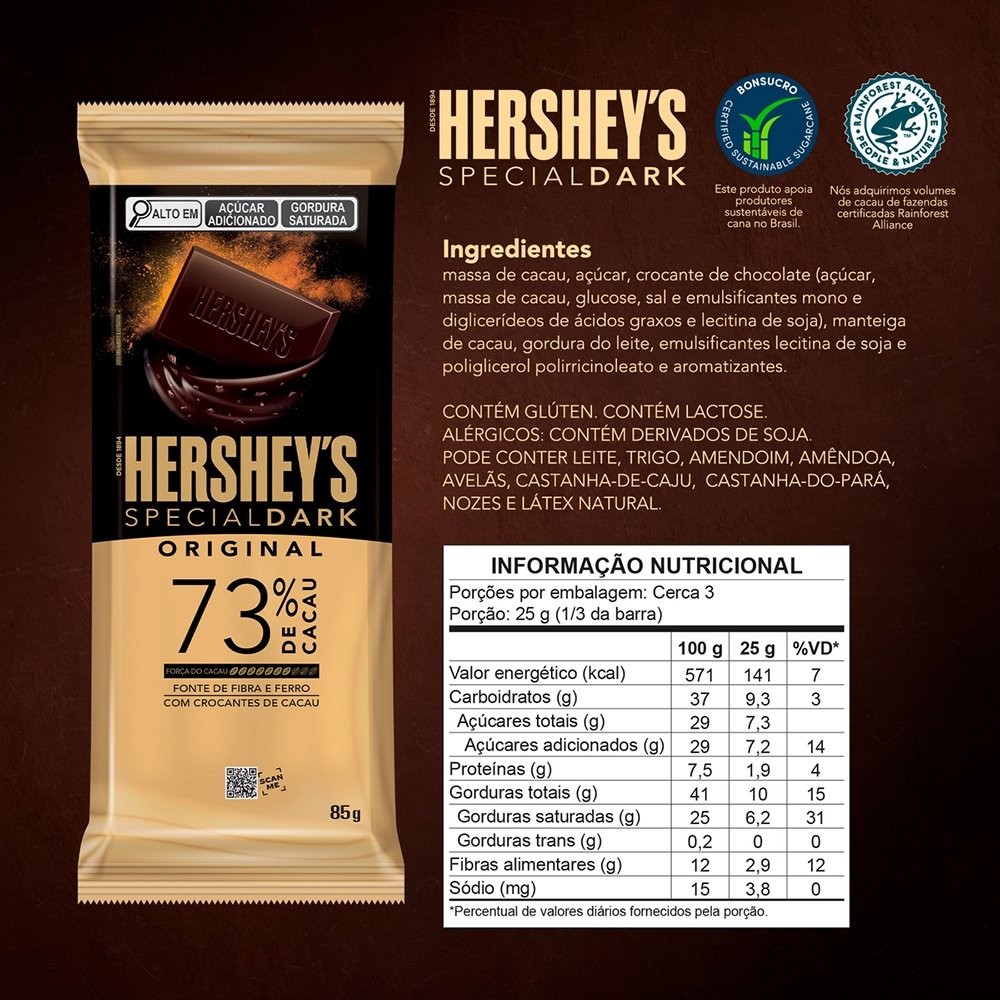 Chocolate Hershey's Special Dark 73% Cacau 85g - Embalagem com 17 Unidades