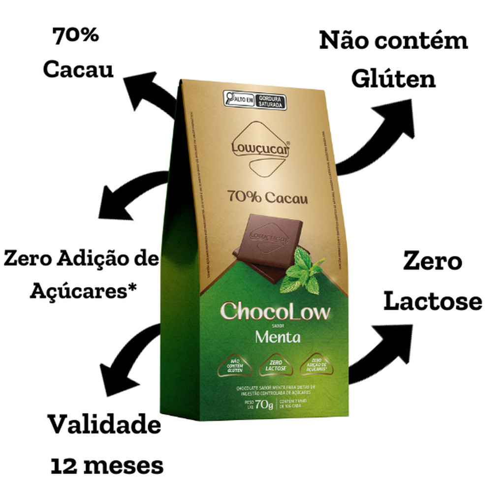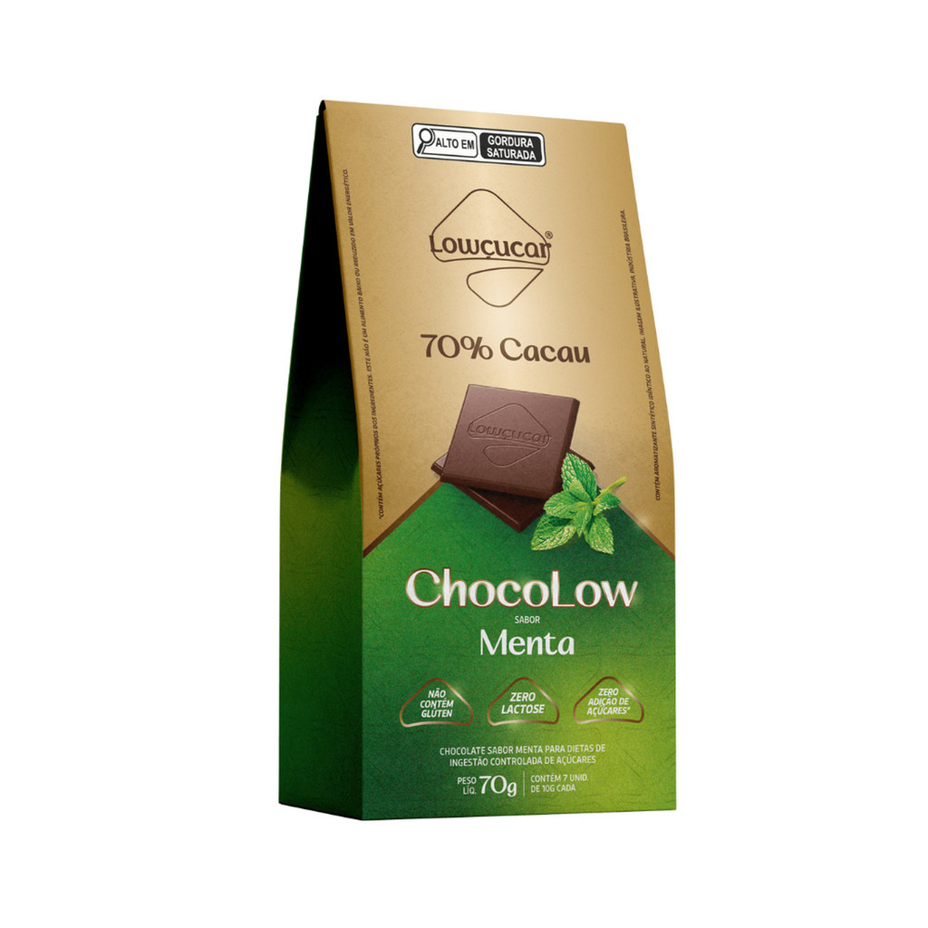 Chocolate Lowçucar 70% Cacau Chocolow sabor Menta Zero Lactose, Zero Açúcares, Zero Glúten 70 gramas