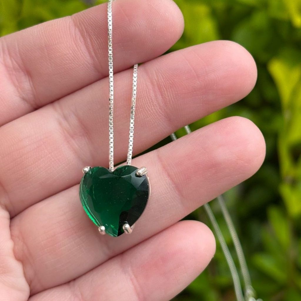 Colar Feminino de Prata 925 Coração Galeria Verde Esmeralda 45cm