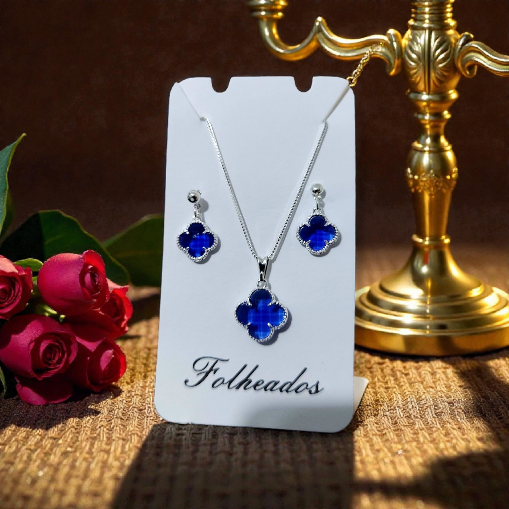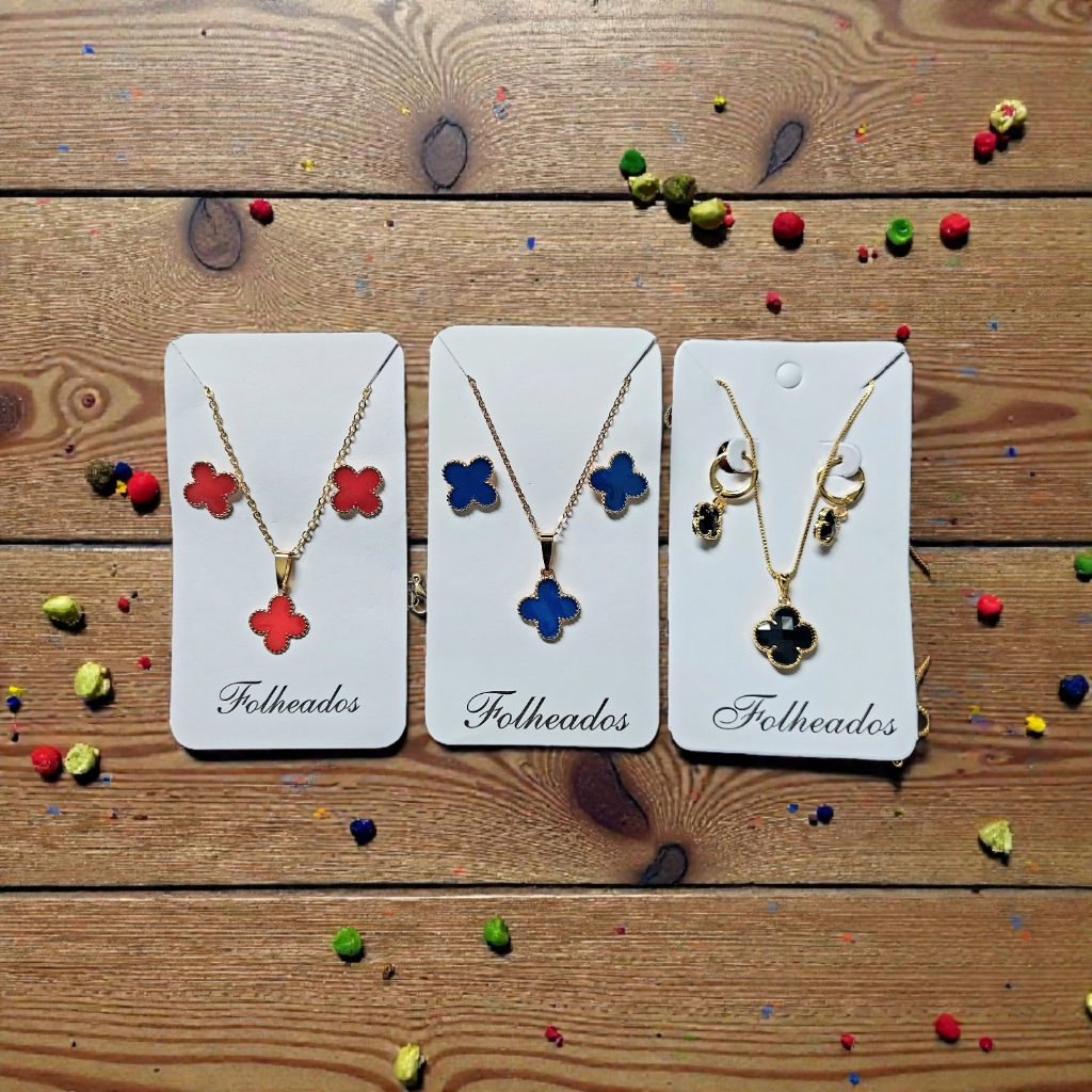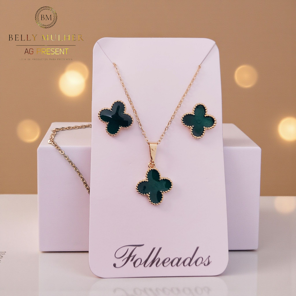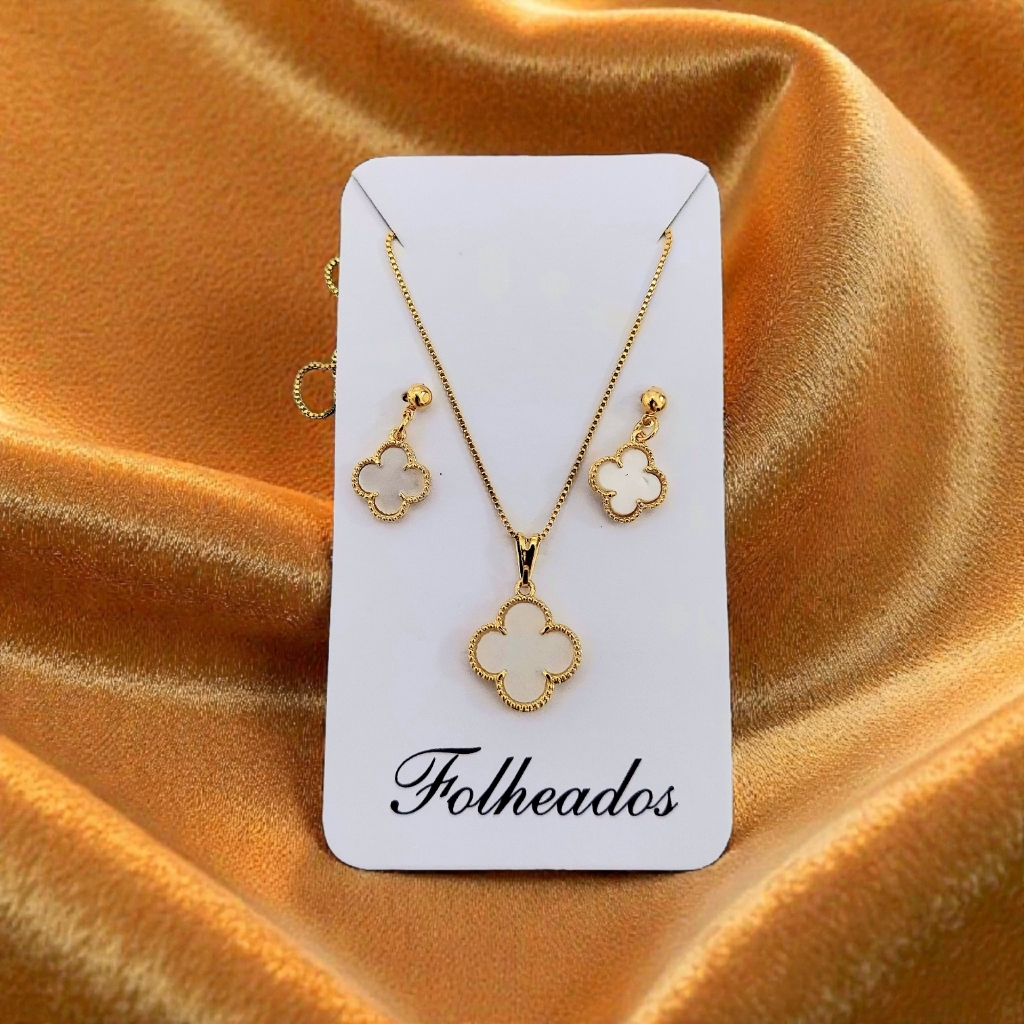 Conjunto Kit Colar + Brinco Trevo Folheado a Prata 925 e Ouro 18k