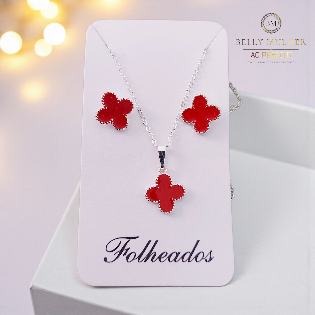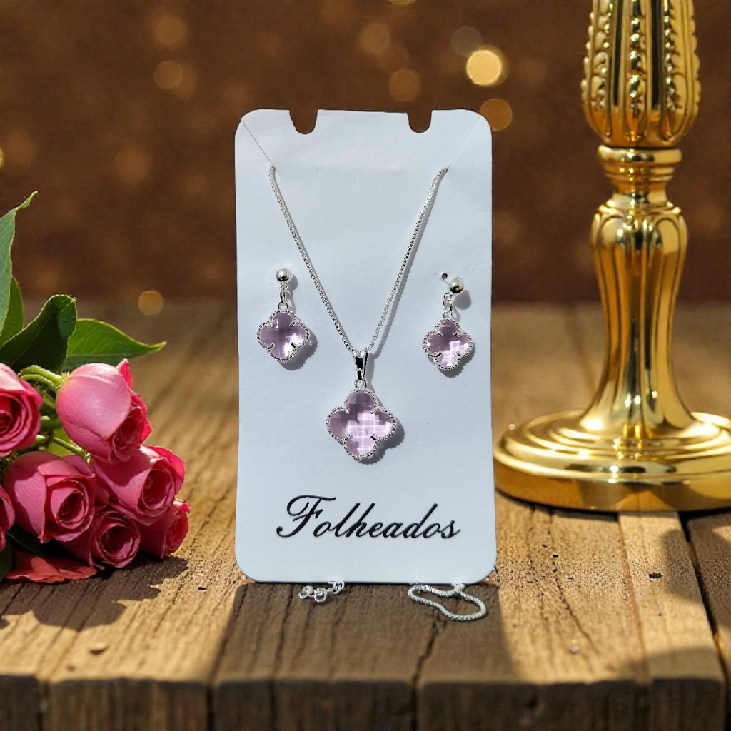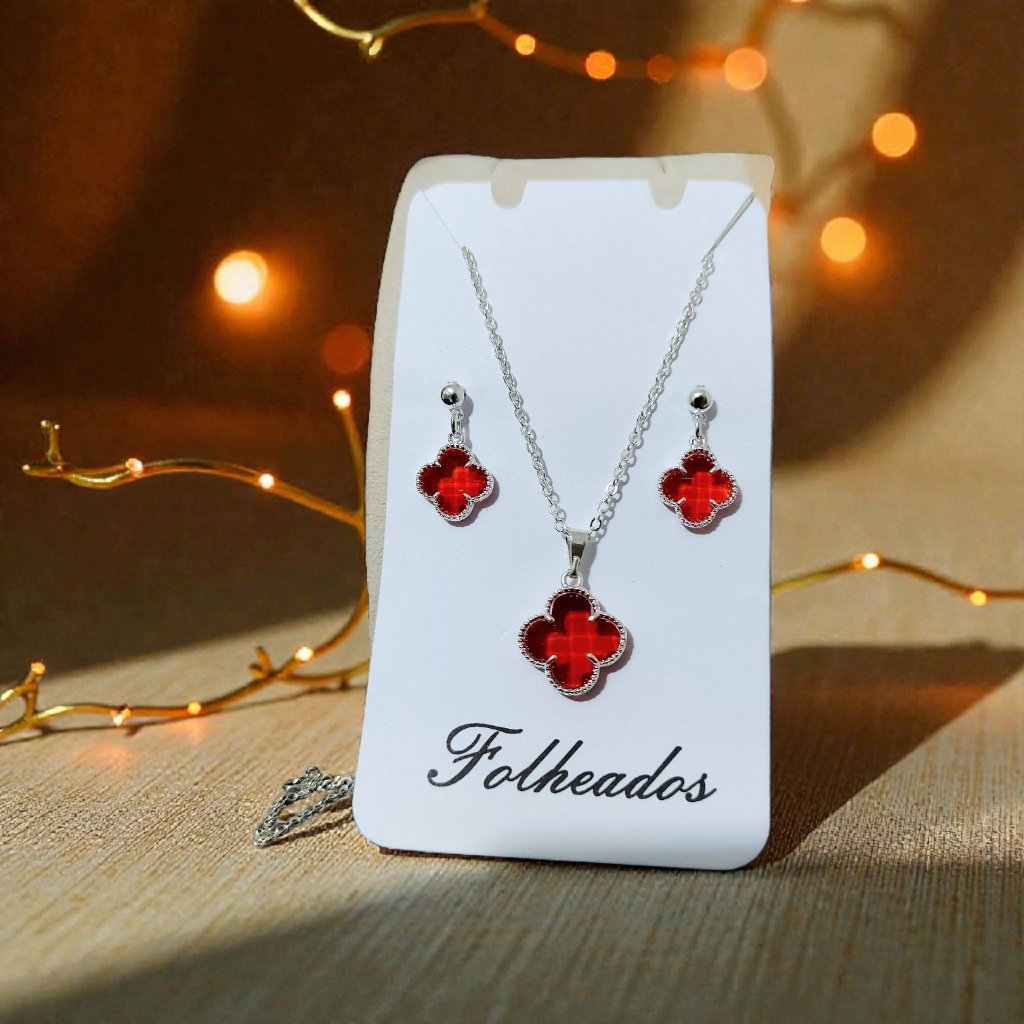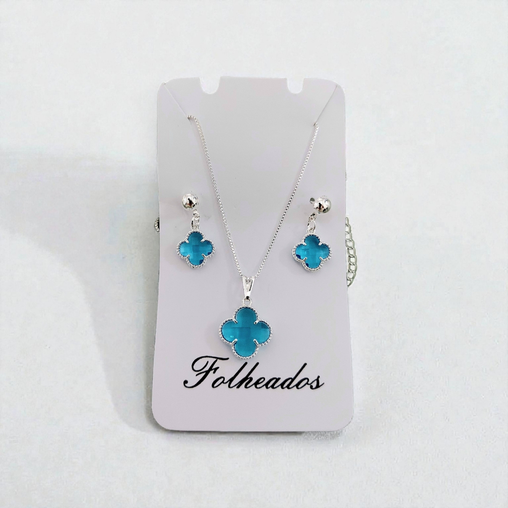 Conjunto Kit Colar + Brinco Trevo Folheado a Prata 925 e Ouro 18k