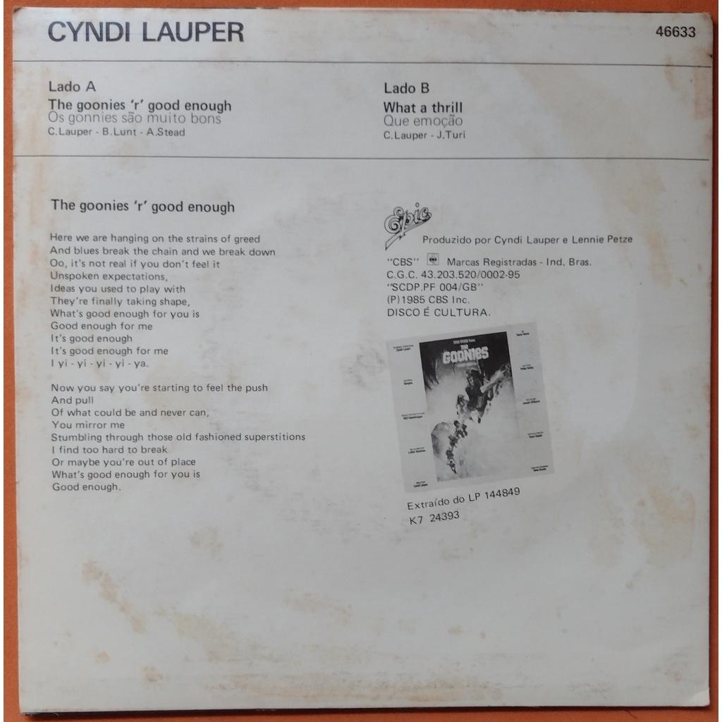 Compacto Cyndi Lauper The Goonies What A Thrill 1985 Vinil