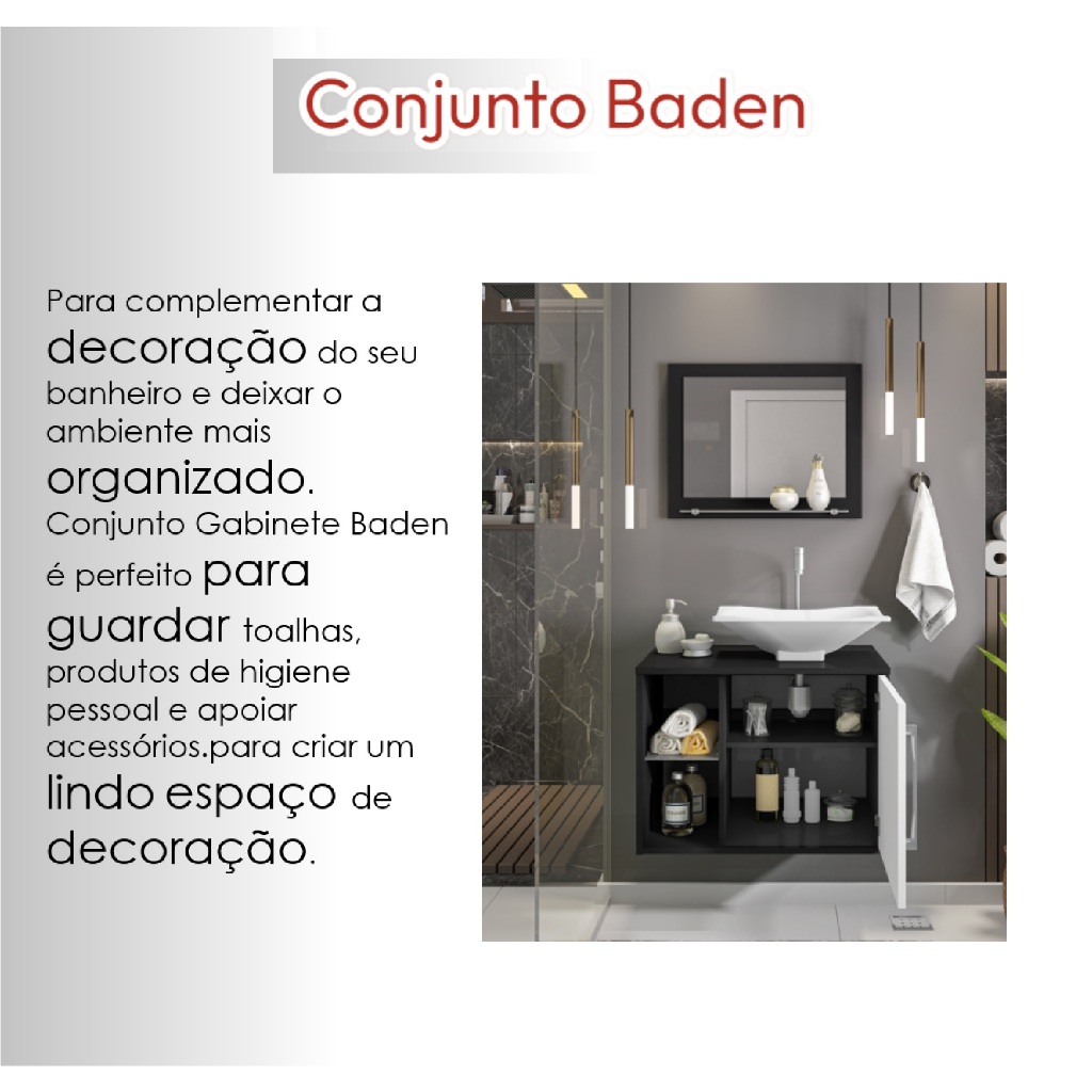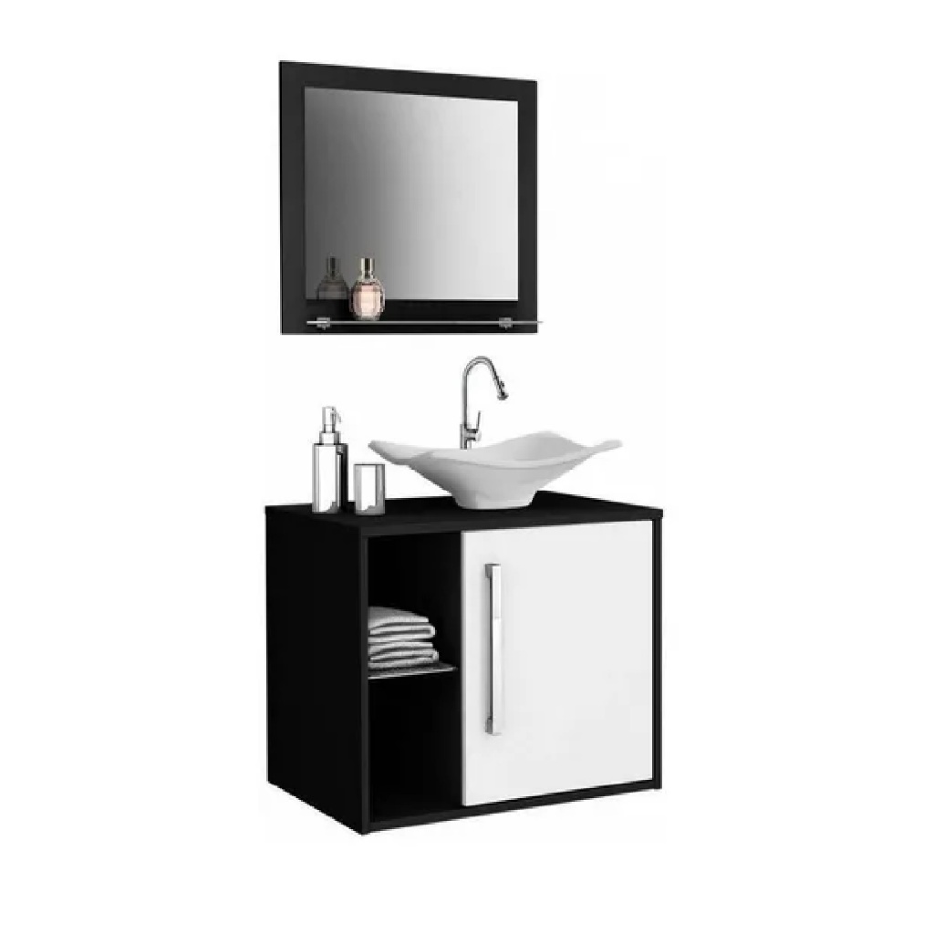 Conjunto Banheiro com Gabinete Suspenso Preto e Branco Cuba de Apoio e Espelho Moderno e Sofisticado