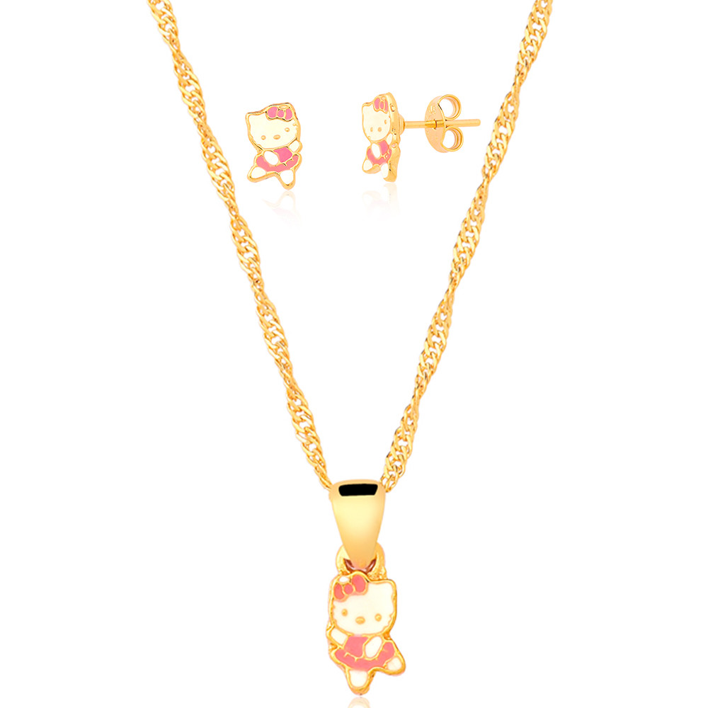 Conjunto Banho de Ouro 18K Infantil Brinco e Colar Hello Kitty (40cm-1,3cm-9mm)