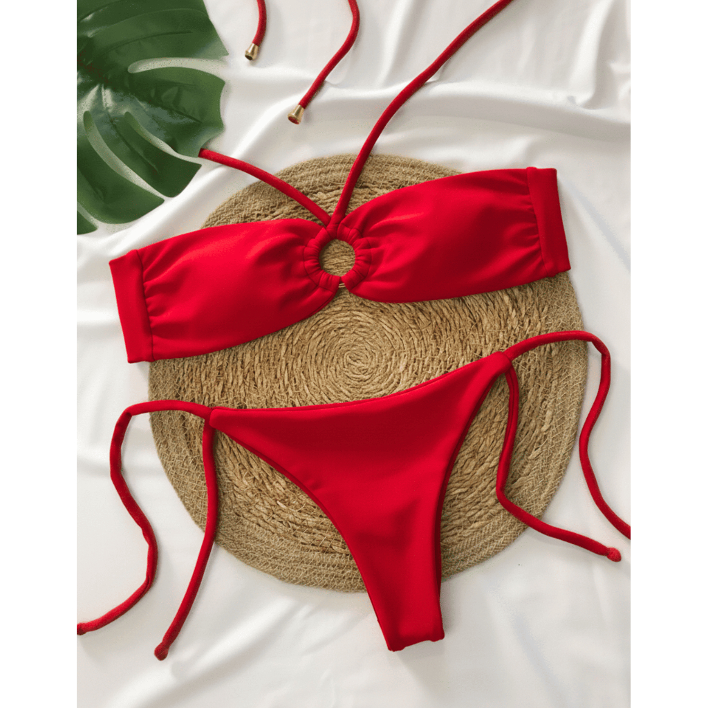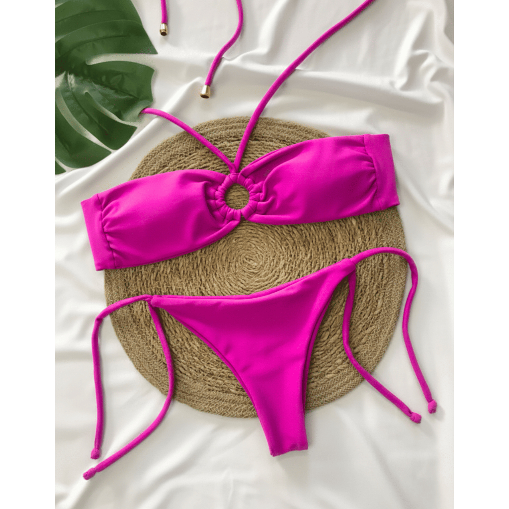Conjunto Biquini - Calcinha de Amarração Lateral - Top Tomara que Caia Argola com Tira Removível.