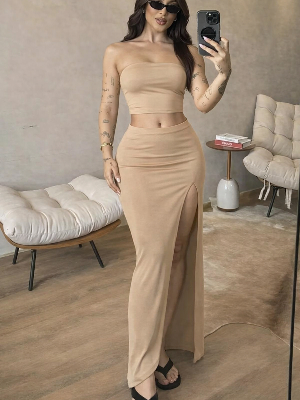 Conjunto Cropped tube Faixa Tomara que Caia e Saia Longa Longuete Com Fenda Lateral Envio Imediato