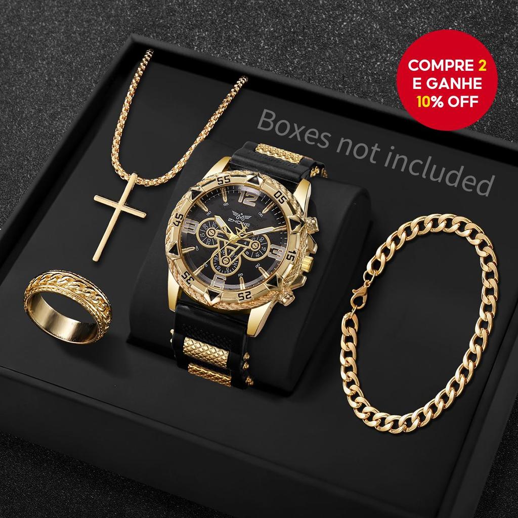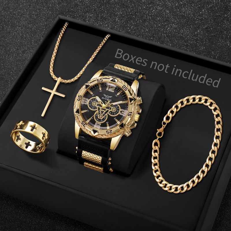 Conjunto De 4 Peças Masculino Moda Negócios Casual Silicone Banda Relógio De Quartzo Com Pulseira Colar Anel Sem Caixa