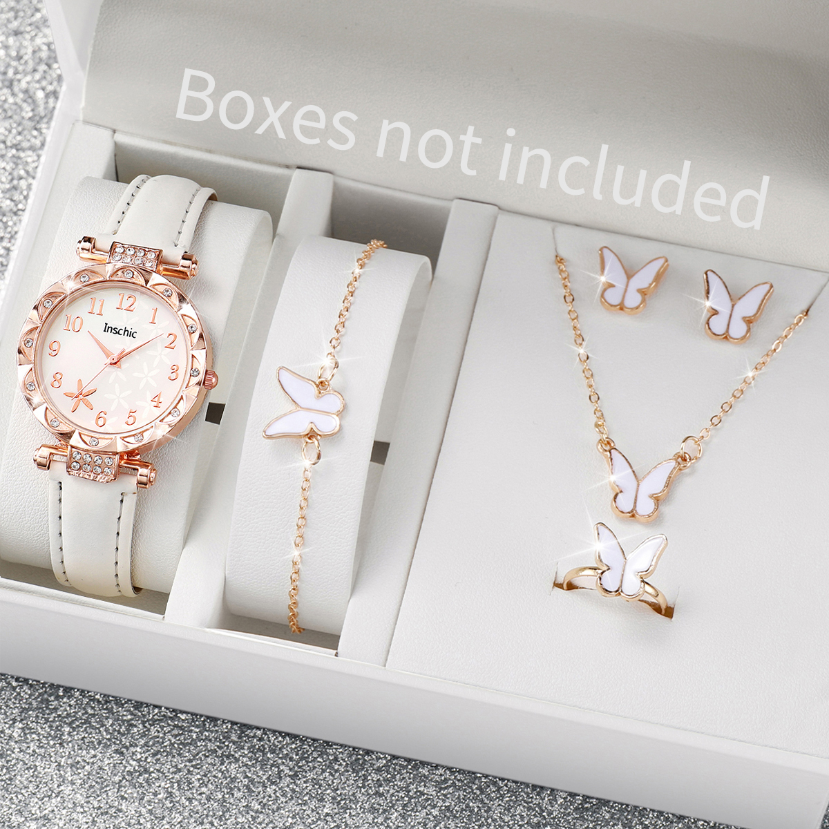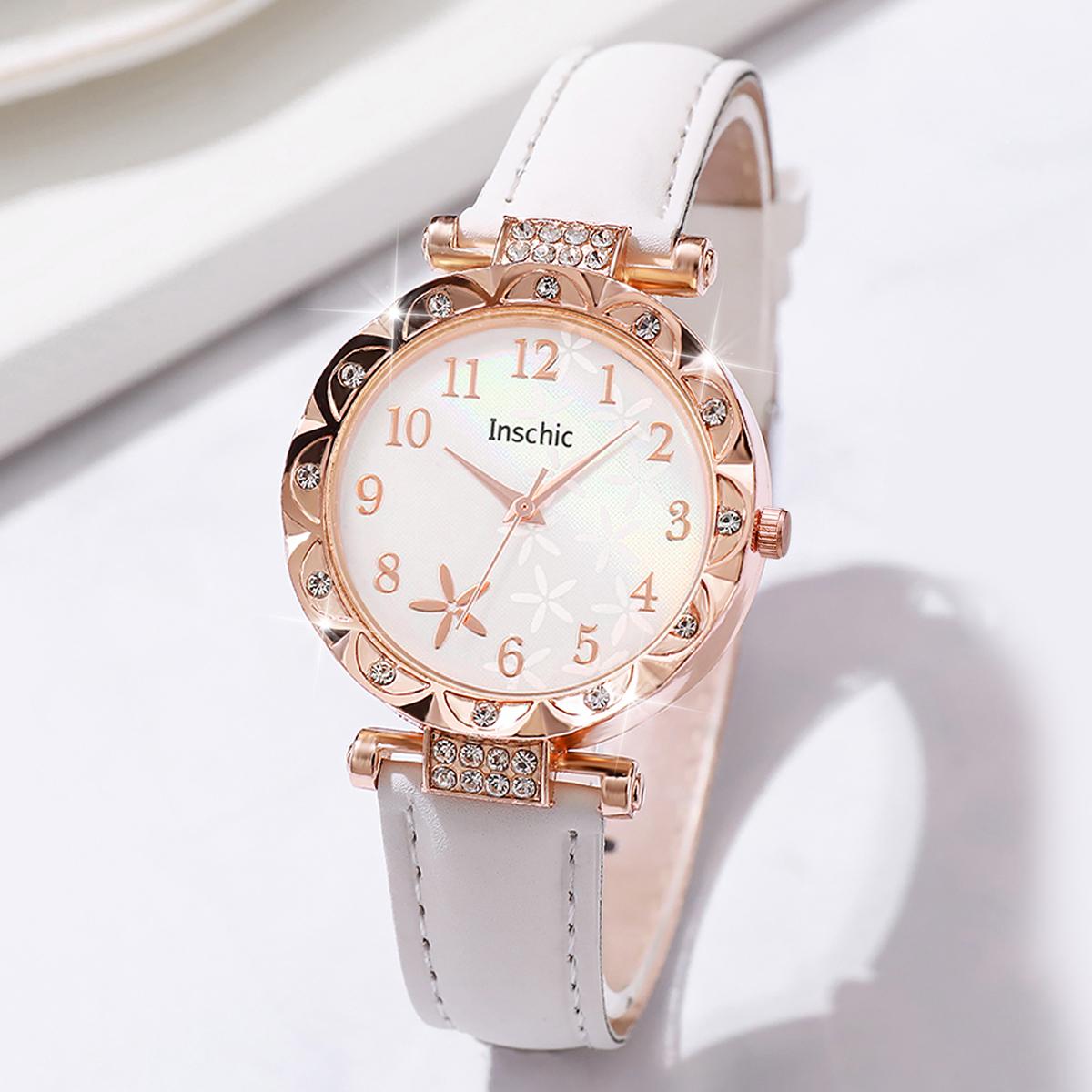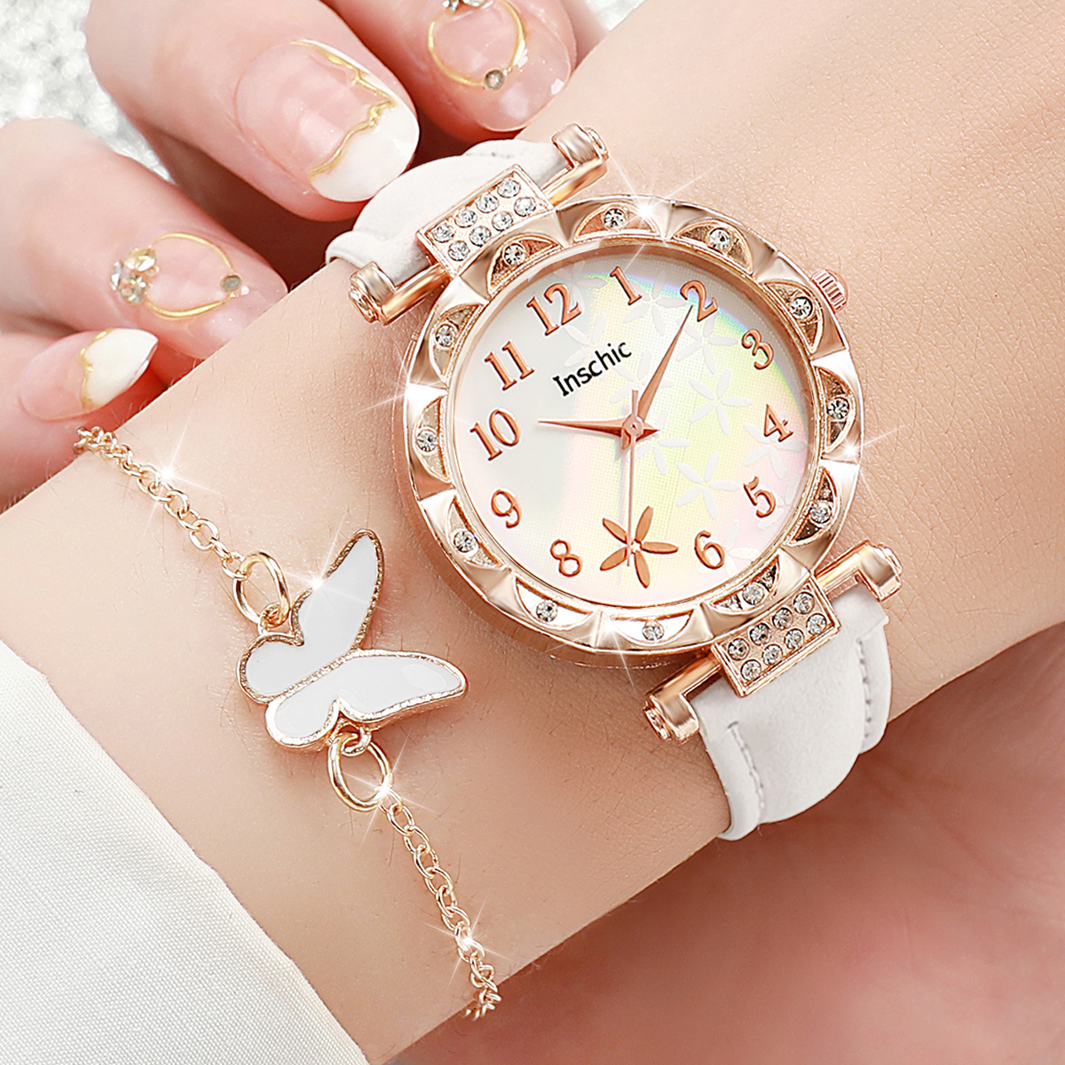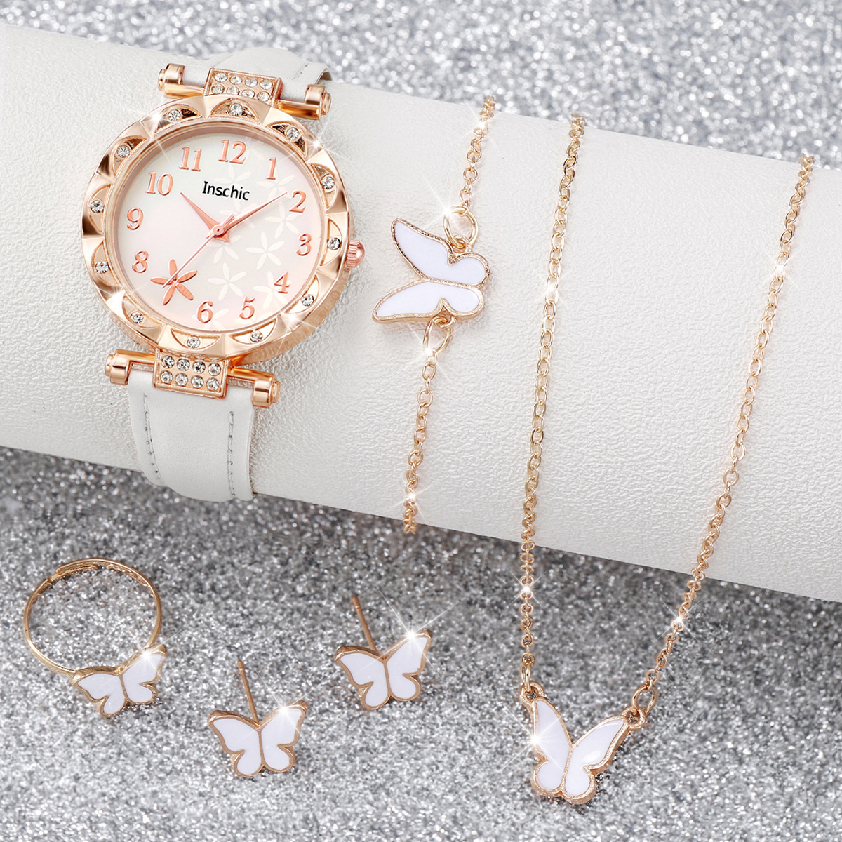 Conjunto De 6 Peças De Relógio De Quartzo Feminino Com Mostrador De Flores Da Moda , Pulseira De Couro Casual , Joias De