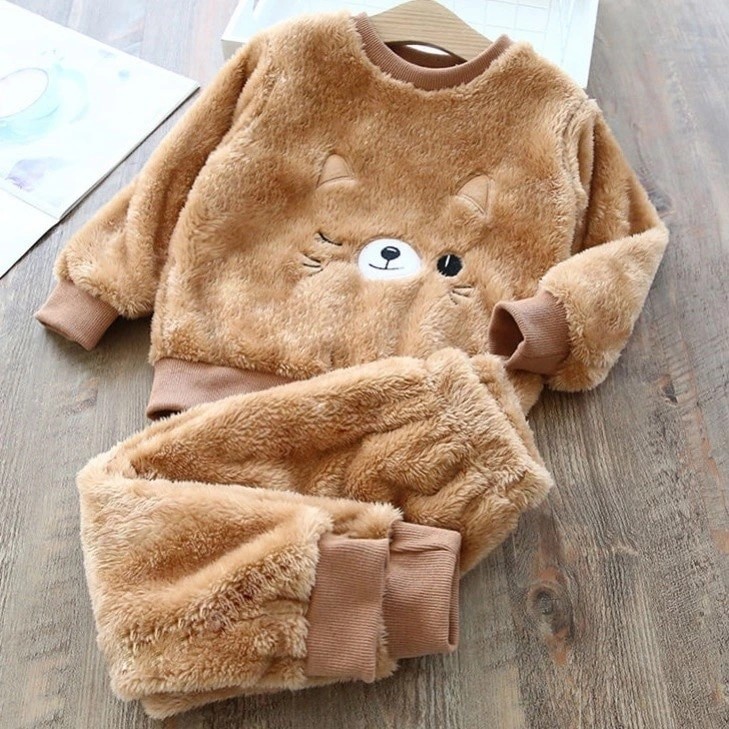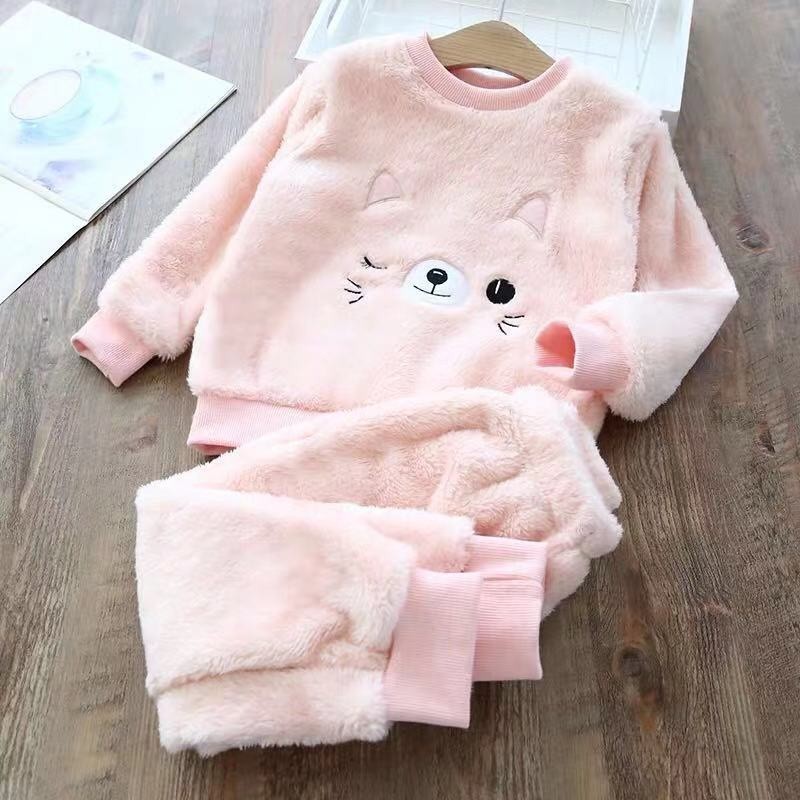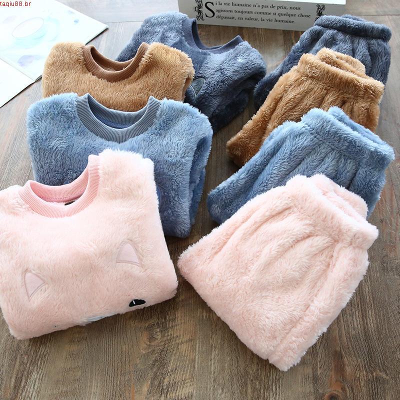 Conjunto De Pijama De Flanela Infantil De Lã De Inverno De Urso De Gato 1-8 Anos