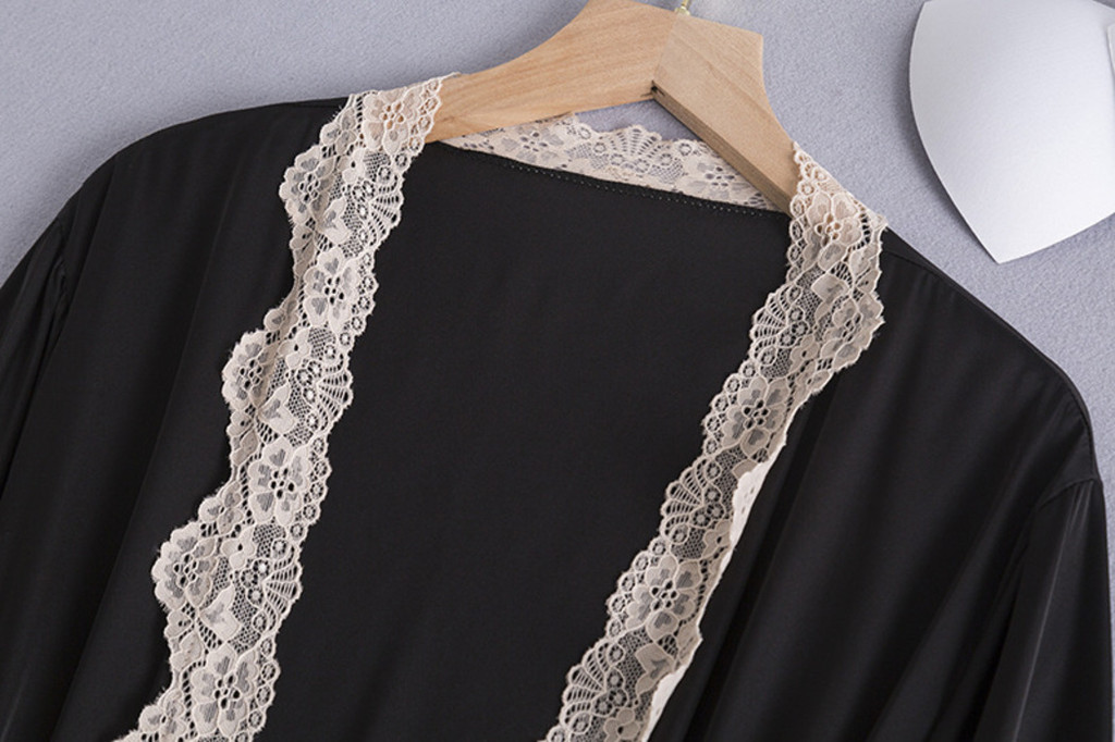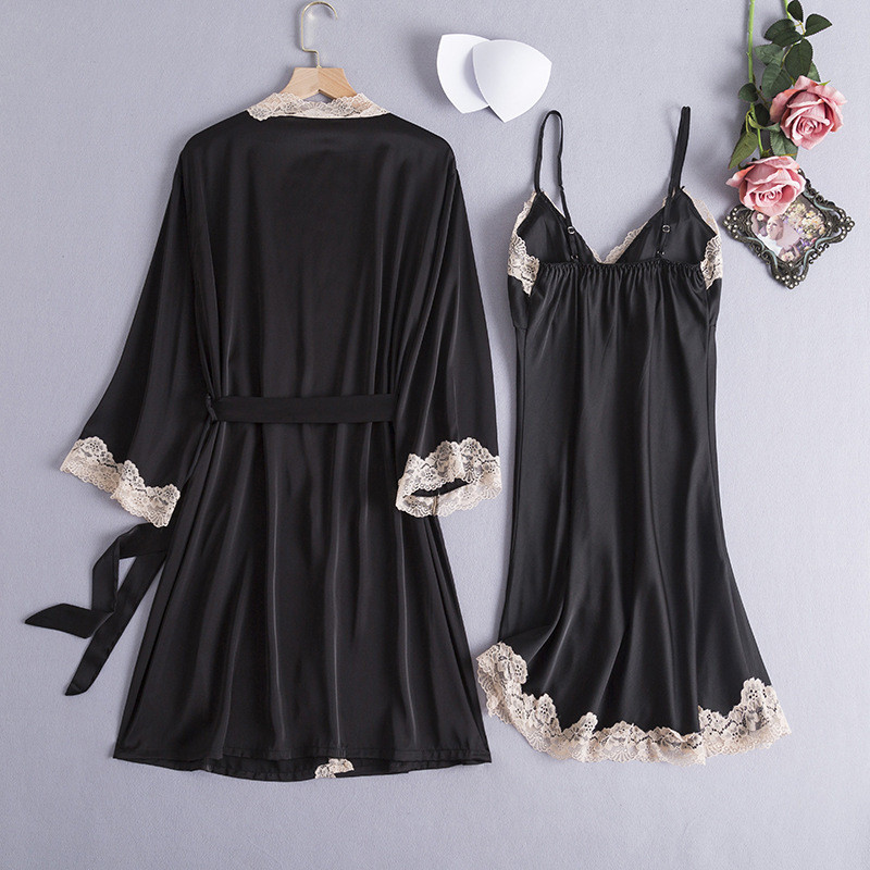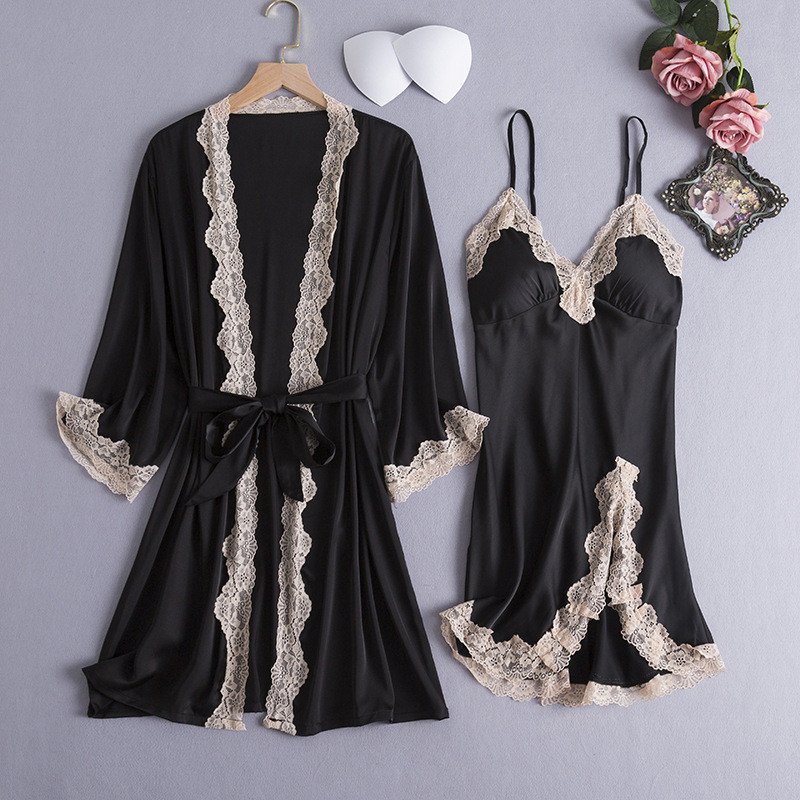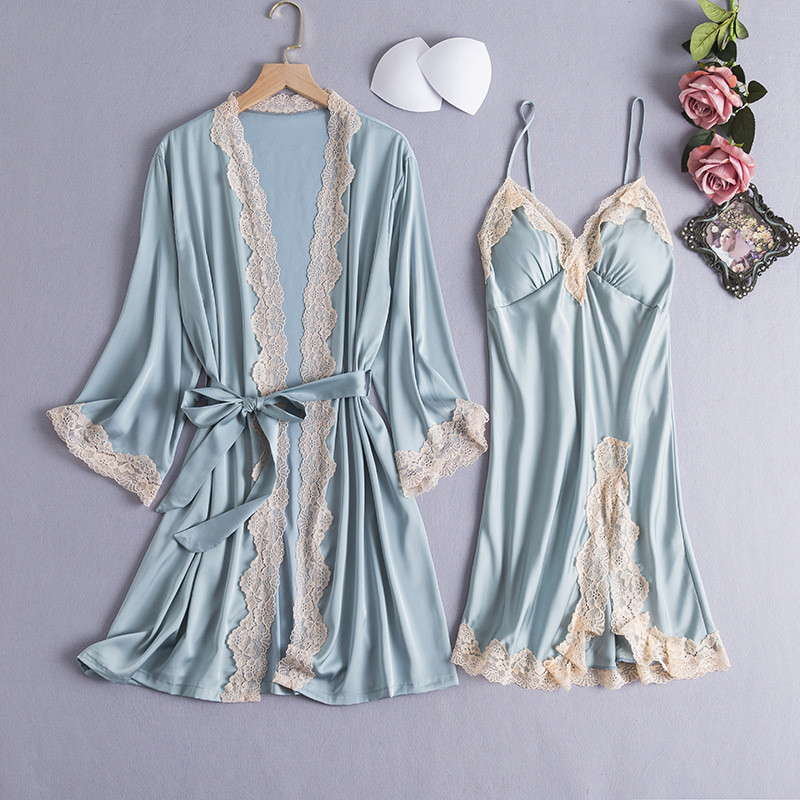 Conjunto De Robe Feminino De Seda Gelo Renda Sexy Camisola Feminina Fina Duas Peças Com Almofada No Peito Pijamas