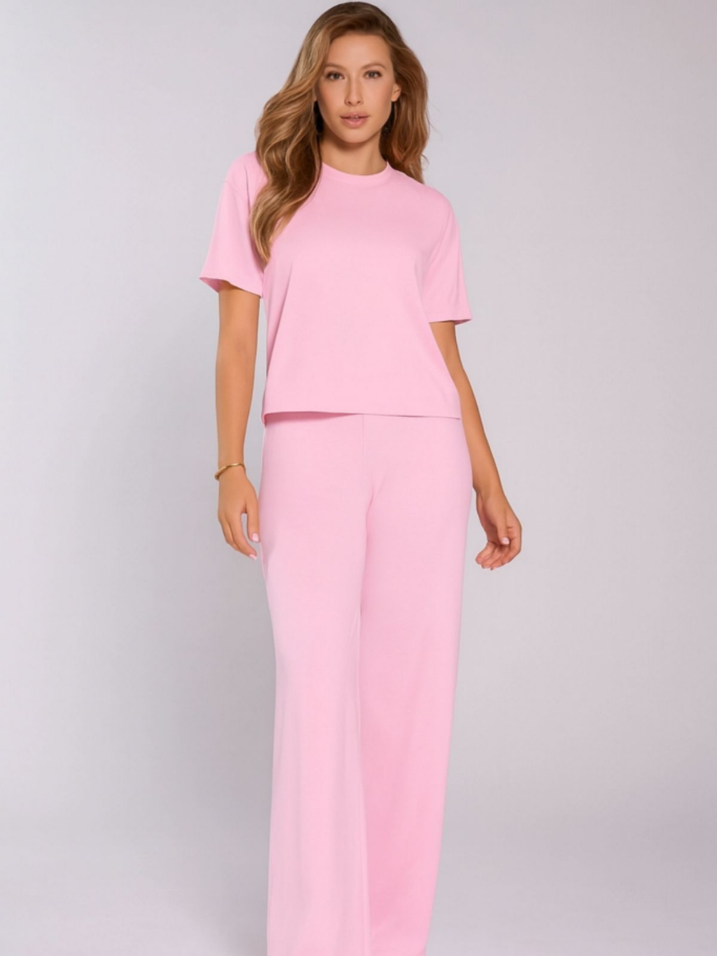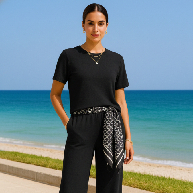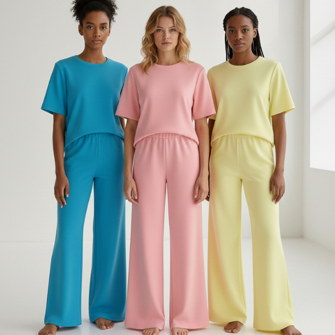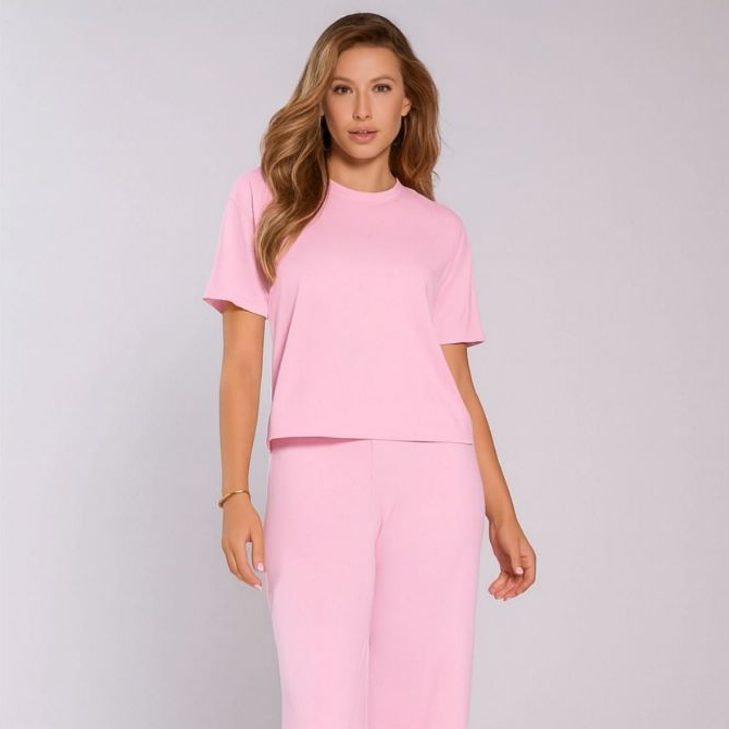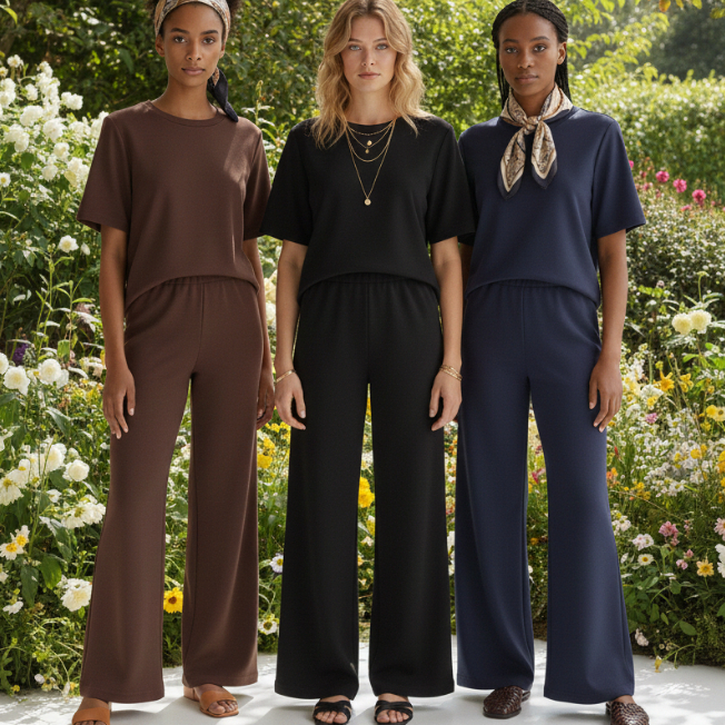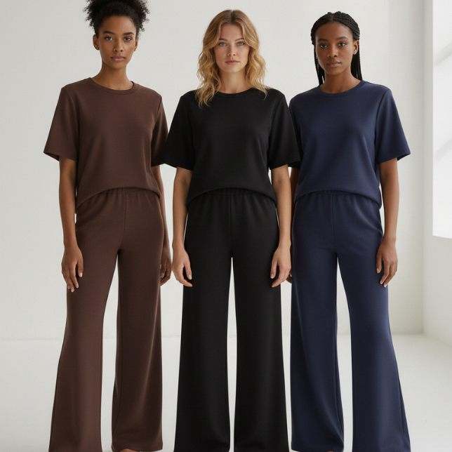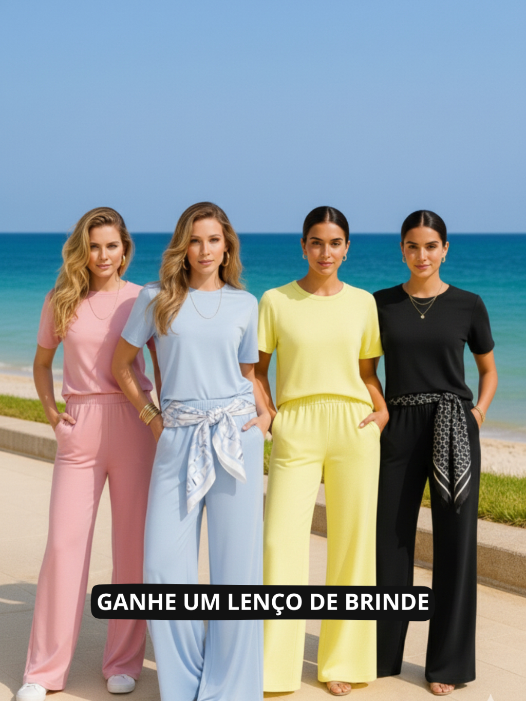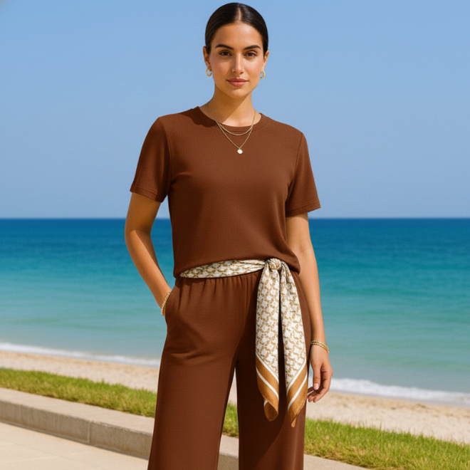 Conjunto Feminino Moletinho Calça Pantalona e Camiseta Confortável Moda Premium Tendência Lenço Brinde