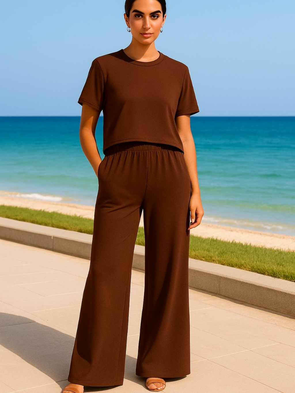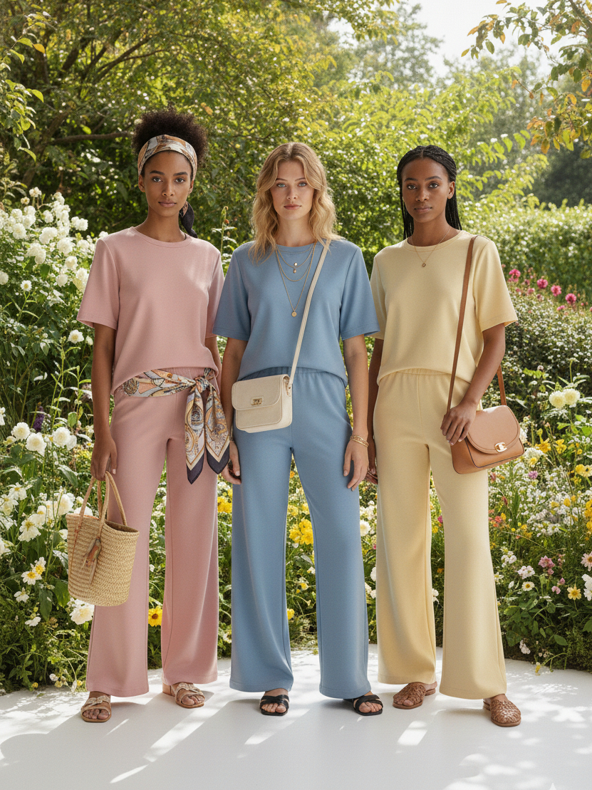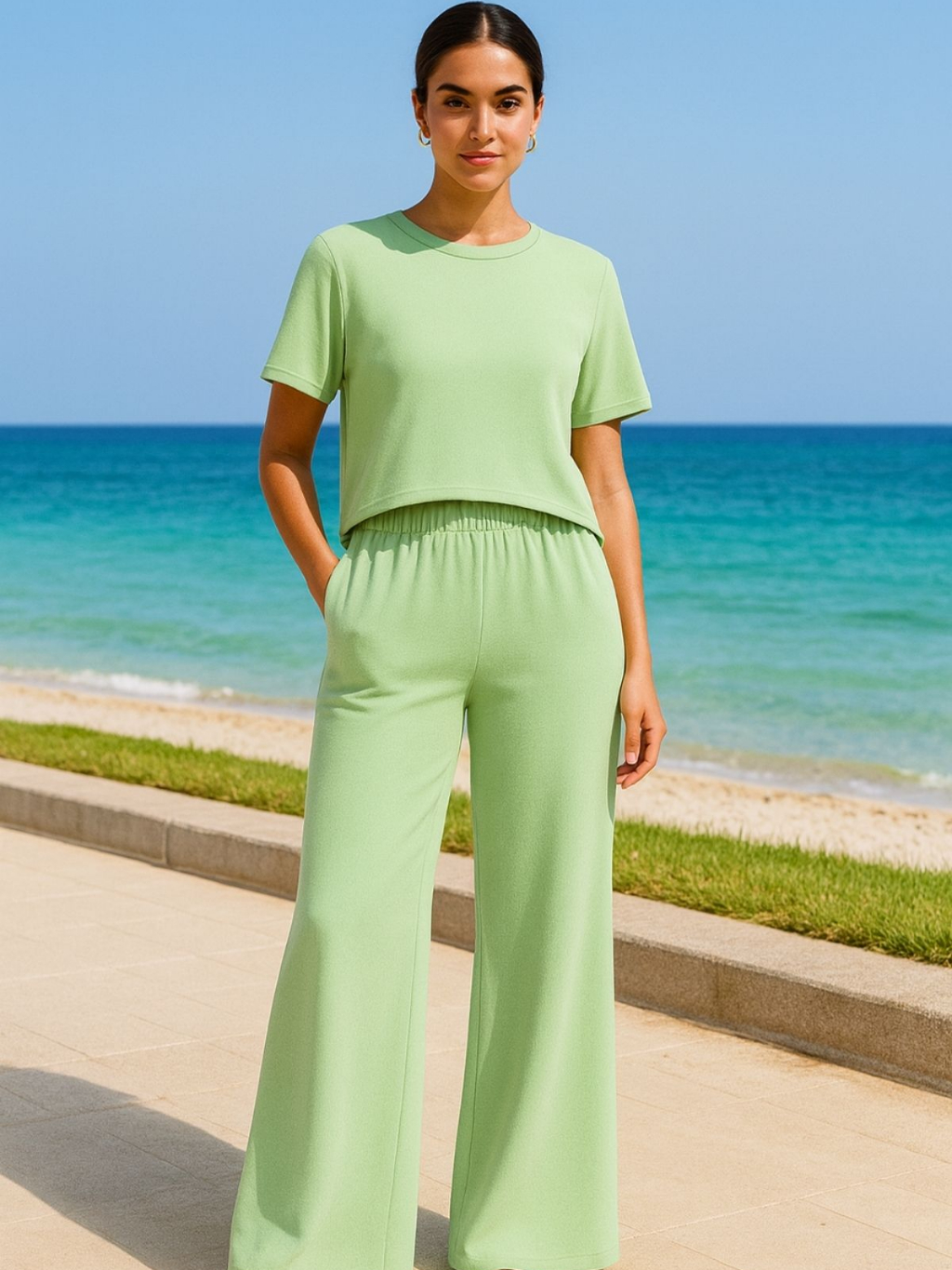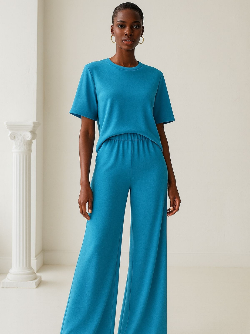 Conjunto Feminino Moletinho Calça Pantalona e Camiseta Confortável Moda Premium Tendência Lenço Brinde