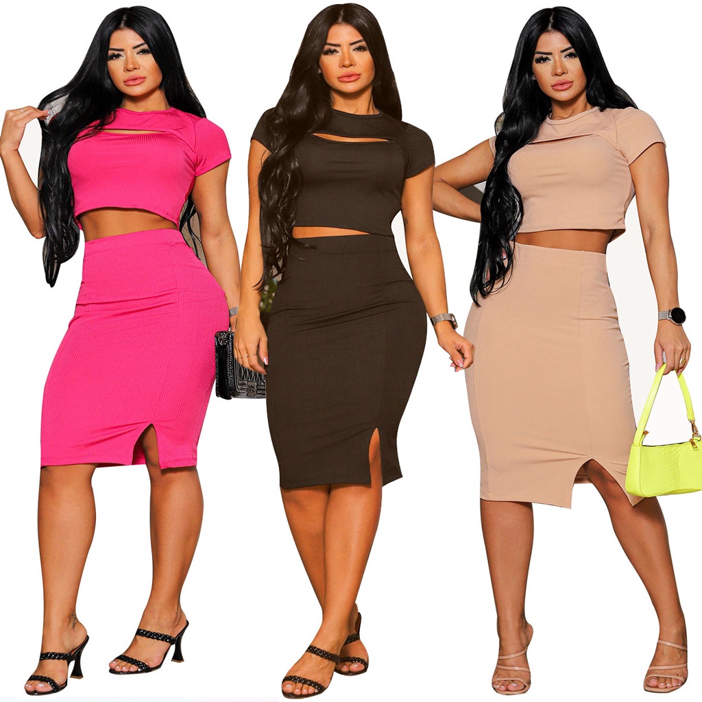 Conjunto Feminino Saia Midi Fenda E Ceopped Top Manga Curta