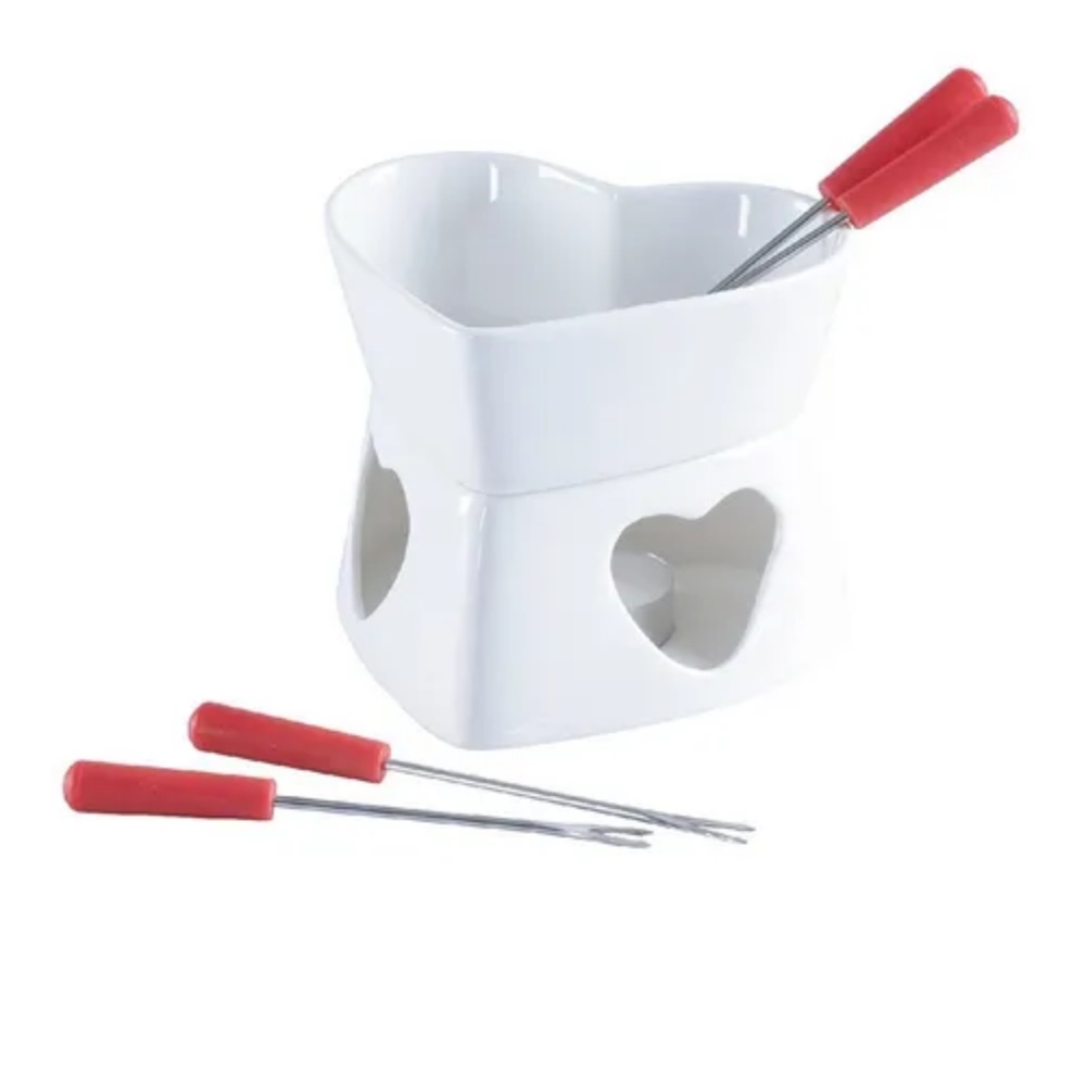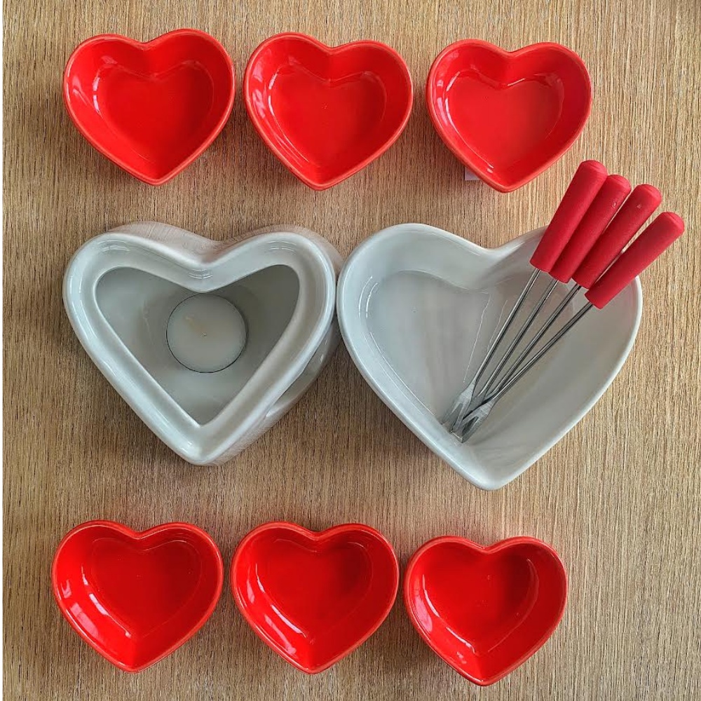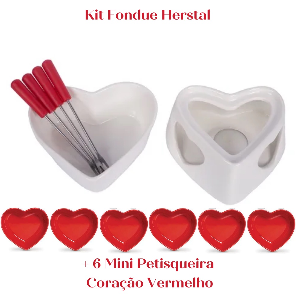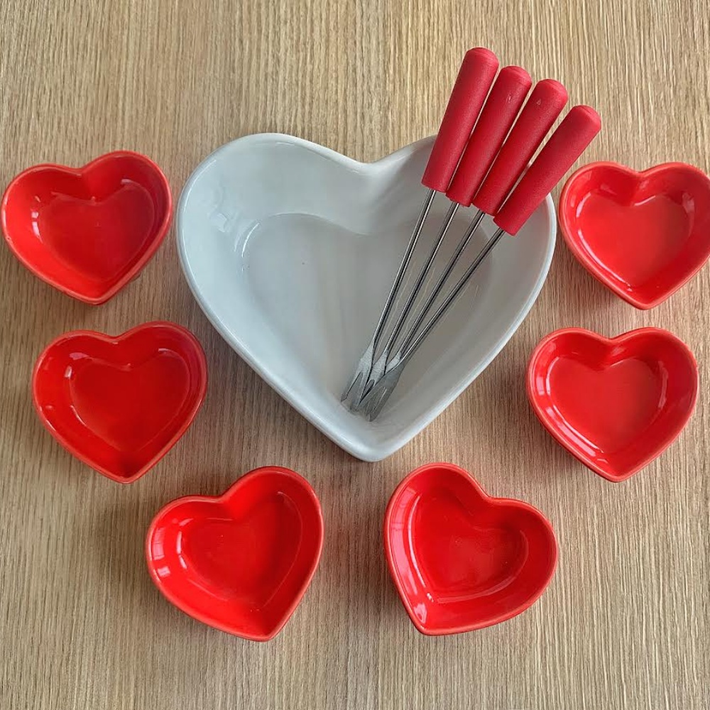 Conjunto Jogo Fondue Cerâmica e Petisqueira Coração Vermelho 13 Peças