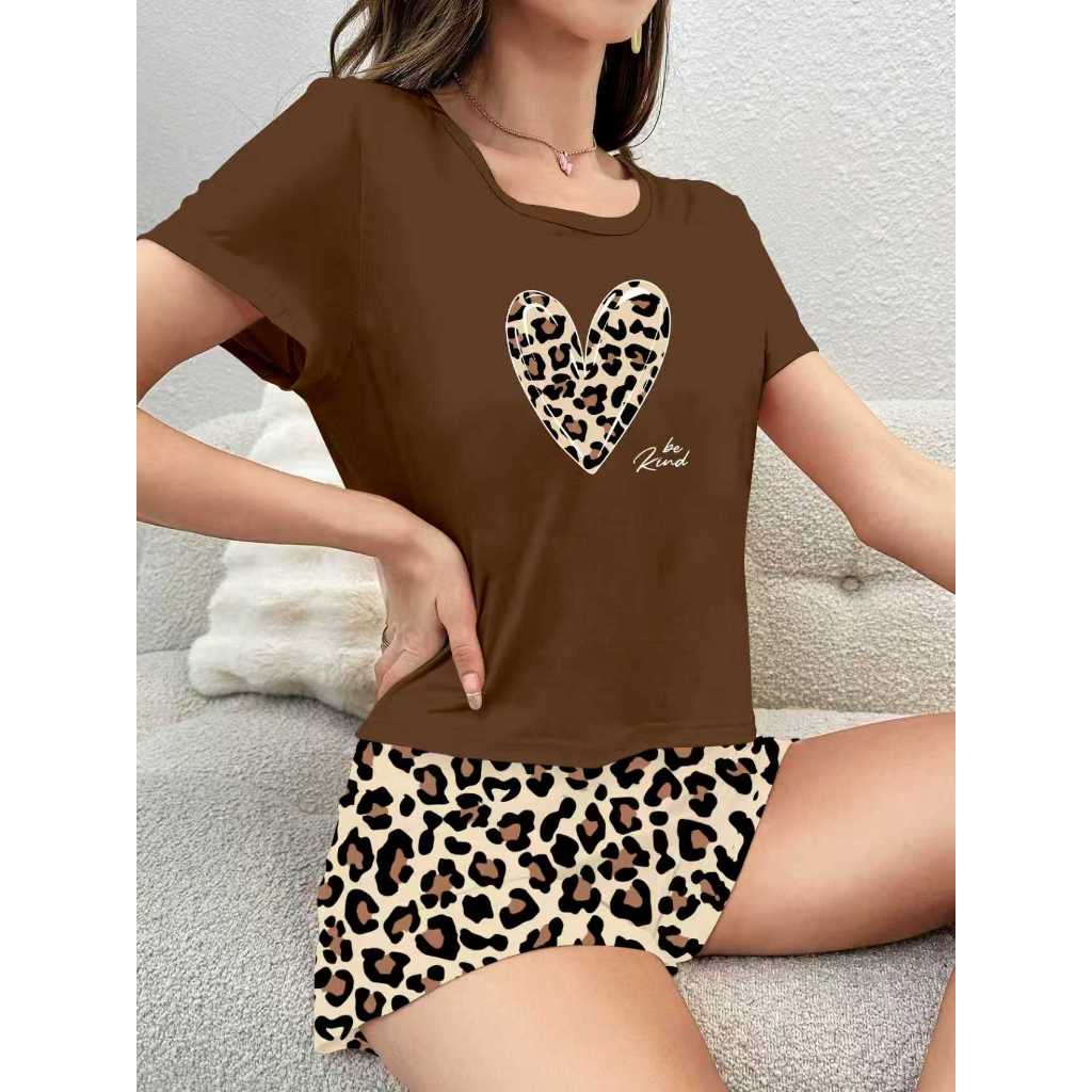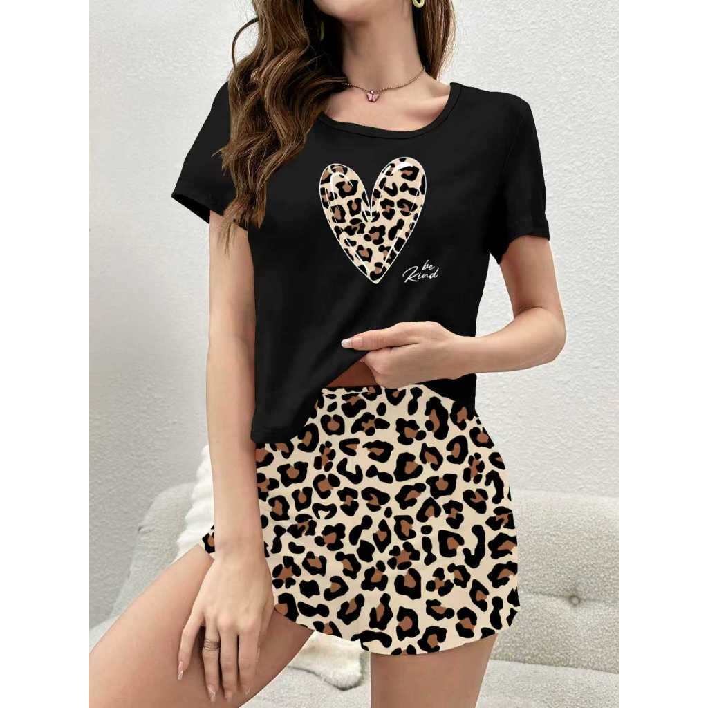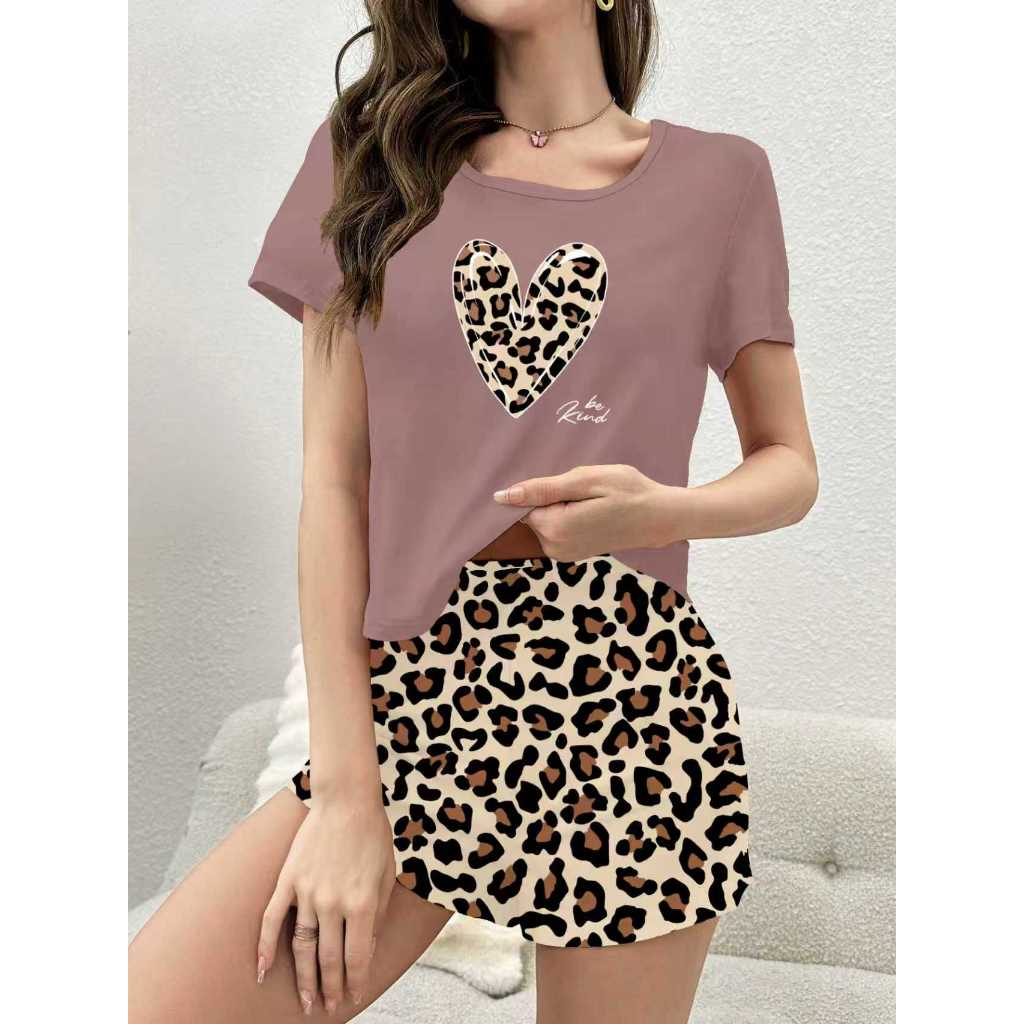 Conjunto Pijama Short Doll Animal Print Coração Feminina