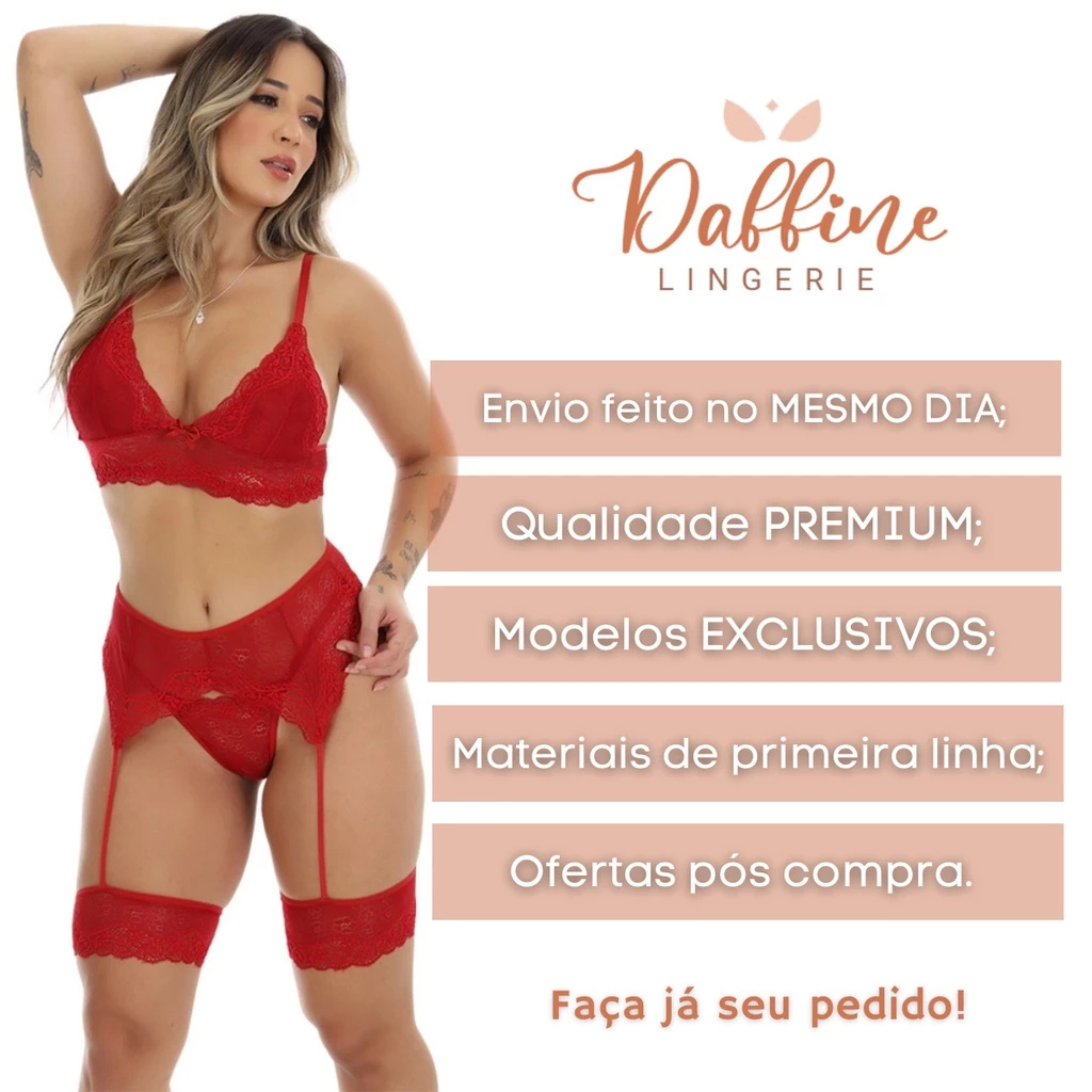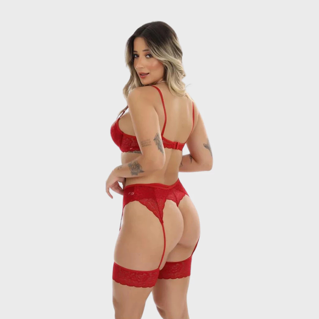Conjunto Sexy de Renda Calcinha e Sutiã + Cinta Liga Lingerie Sensual Sem Bojo de Luxo