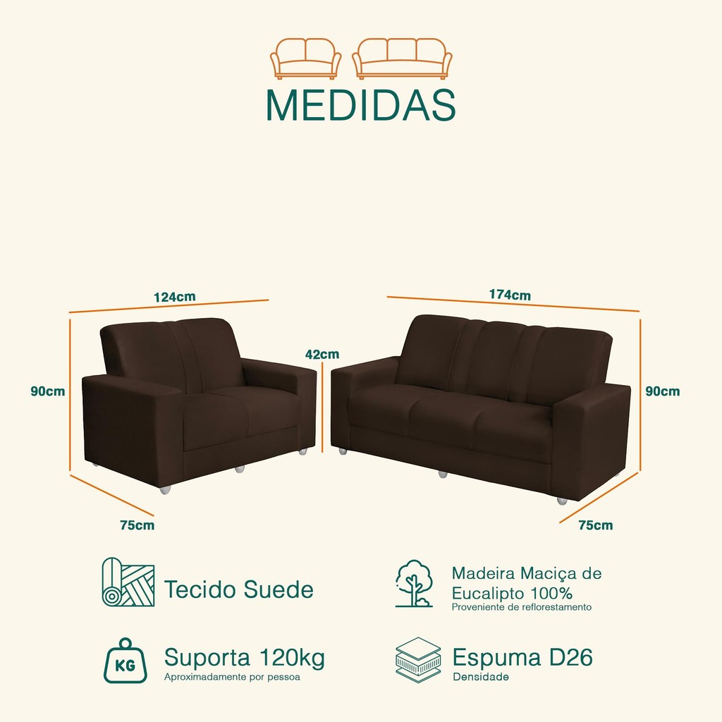 Conjunto Sofá 1,74 x 1,24m 3 e 2 Lugares Suede Roma Marrom Café