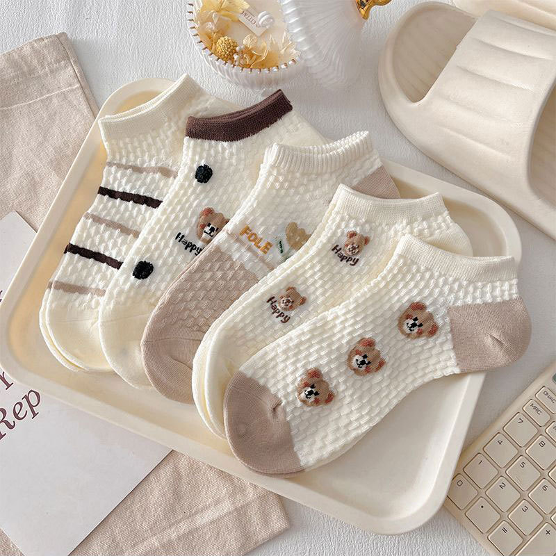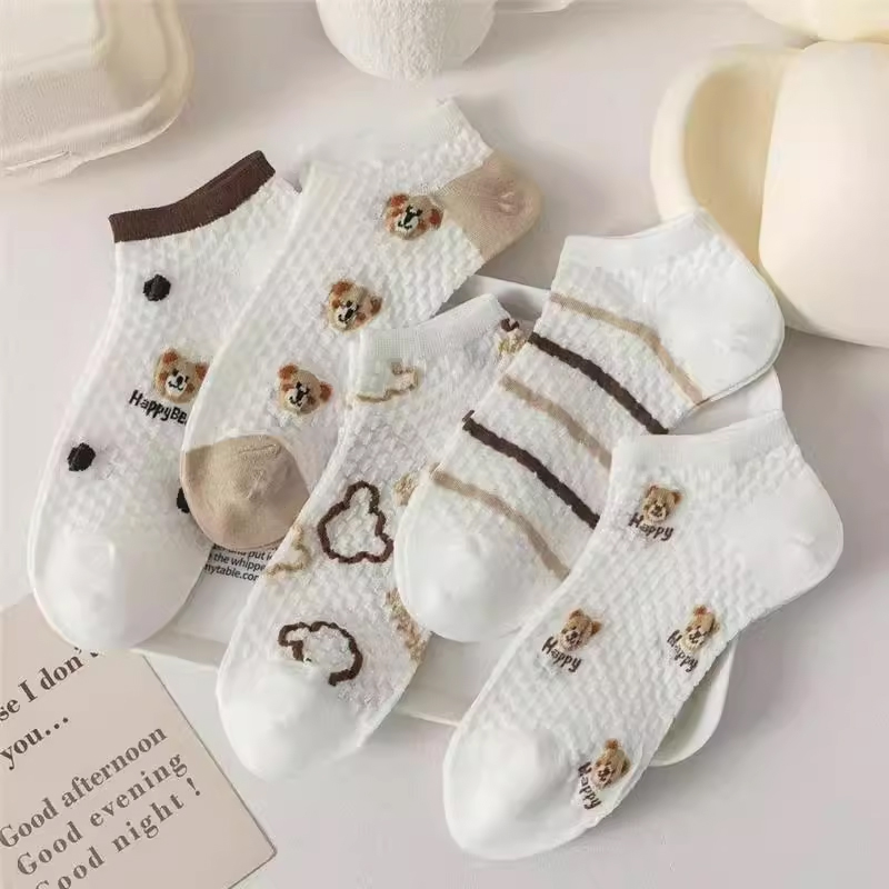 Conjunto com 5 Pares de Meias Femininas - Estampas de Animais e Flores, Algodão Respirável, Estilo Coreano.